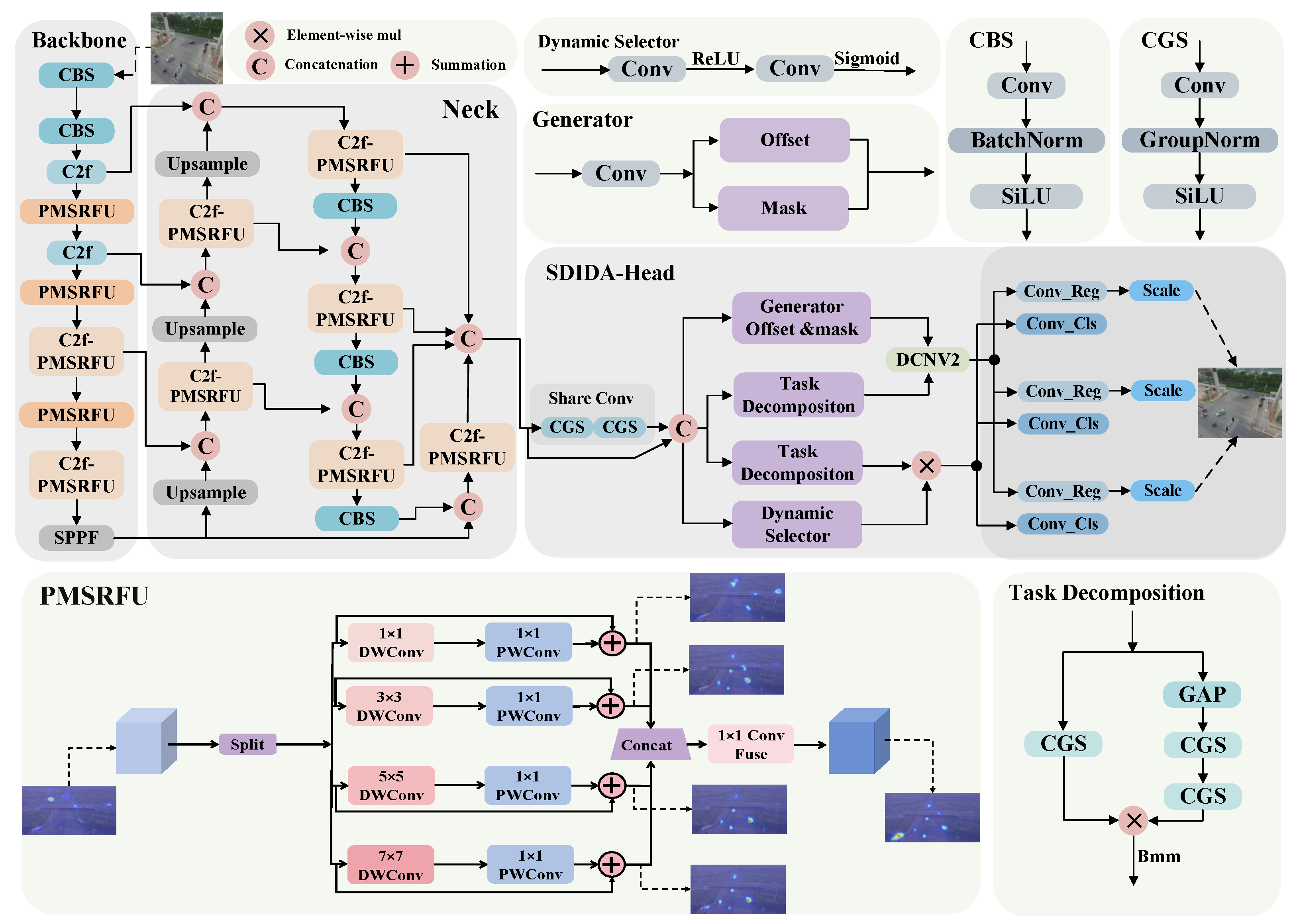 Figure 2. First, the PMSRFU is integrated into the Backbone to enhance the model’s target perception ability across multiple scales. Second, the C2f-PMSRFU module is constructed to replace the original C2f module, reducing the model’s parameter count while retaining the original C2f’s efficient feature extraction capability. By alternately stacking PMSRFU and C2f-PMSRFU modules, the model’s receptive field is further expanded, significantly improving its representation ability for small targets. Finally, a detection head with task collaborative interaction and alignment mechanisms is designed. By introducing feature collaborative interaction and dynamic alignment mechanisms between classification and regression tasks, it enhances the information sharing and alignment capabilities between branches. Meanwhile, combined with the Scale layer, it achieves dynamic adaptation to multi-scale targets, significantly improving the model’s detection accuracy in complex scenarios.