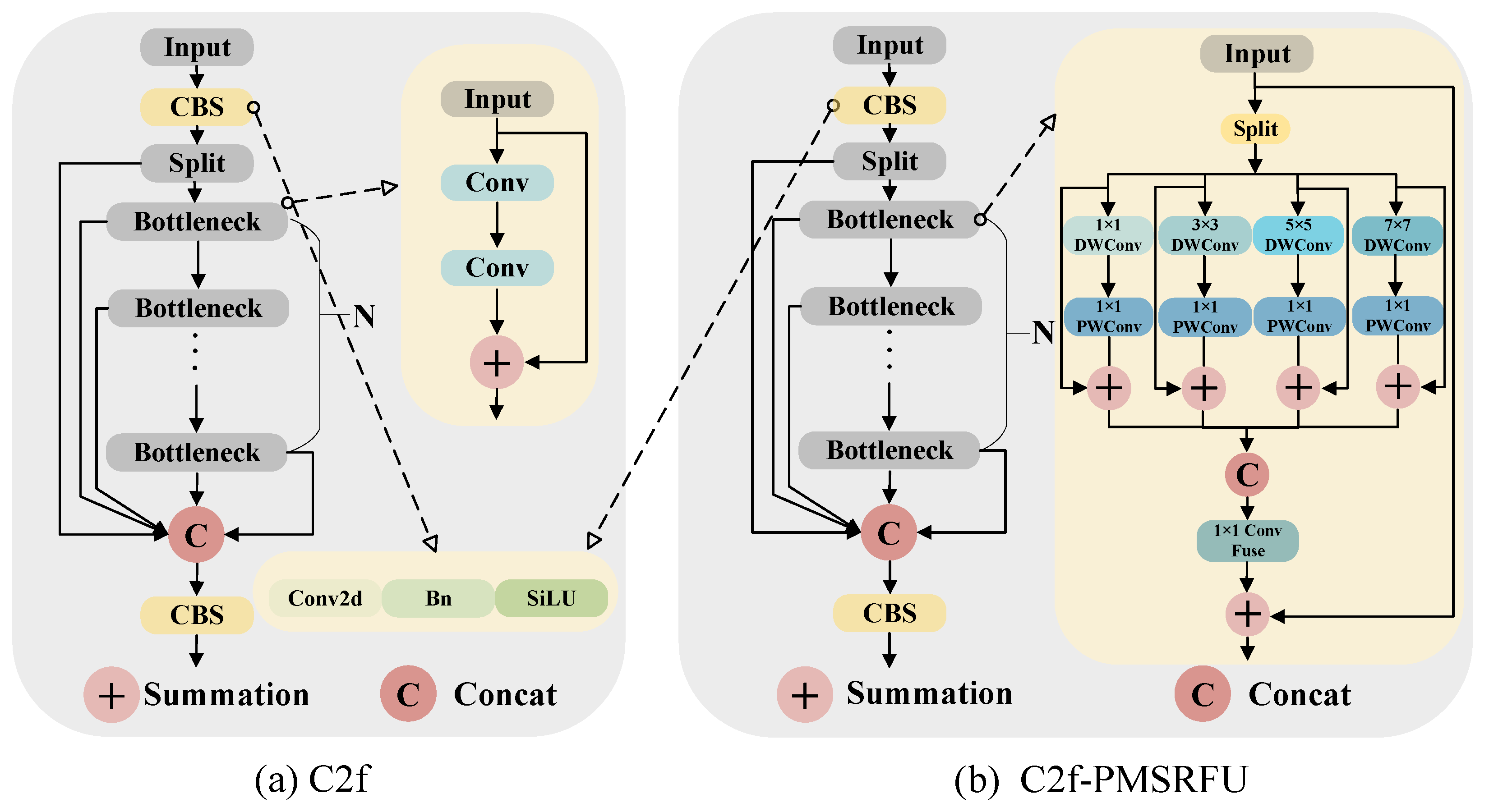 Figure 4b. The C2f module mainly consists of CBS convolutional structures and multiple Bottleneck modules, and has good feature extraction capabilities. However, when dealing with targets with significant scale changes and complex backgrounds, its limited receptive field coverage makes it difficult to fully capture contextual information. To alleviate the above problems, the C2f-PMSRFU module integrates a parallel multi-scale receptive field mechanism while retaining the overall framework of the original C2f module. Similar to PMSRFU, after channel division, four parallel branches are added to the original feature channels. These branches use DWConv and PWConv with different kernel sizes (1 × 1, 3 × 3, 5 × 5, 7 × 7) to extract multi-scale semantic information, thereby enhancing the module’s scale diversity in feature representation. Subsequently, the features extracted by each branch are fused with the corresponding input features through residual connections, further enhancing local semantic stability and detail retention. The multi-scale features are then concatenated along the channel dimension to integrate semantic information from different receptive fields. Next, a 1 × 1 convolution is used to complete feature compression and unified mapping. Finally, the processed features are fused with the features from the main path through a residual connection, outputting a feature map with higher semantic richness and stronger feature representation capabilities.