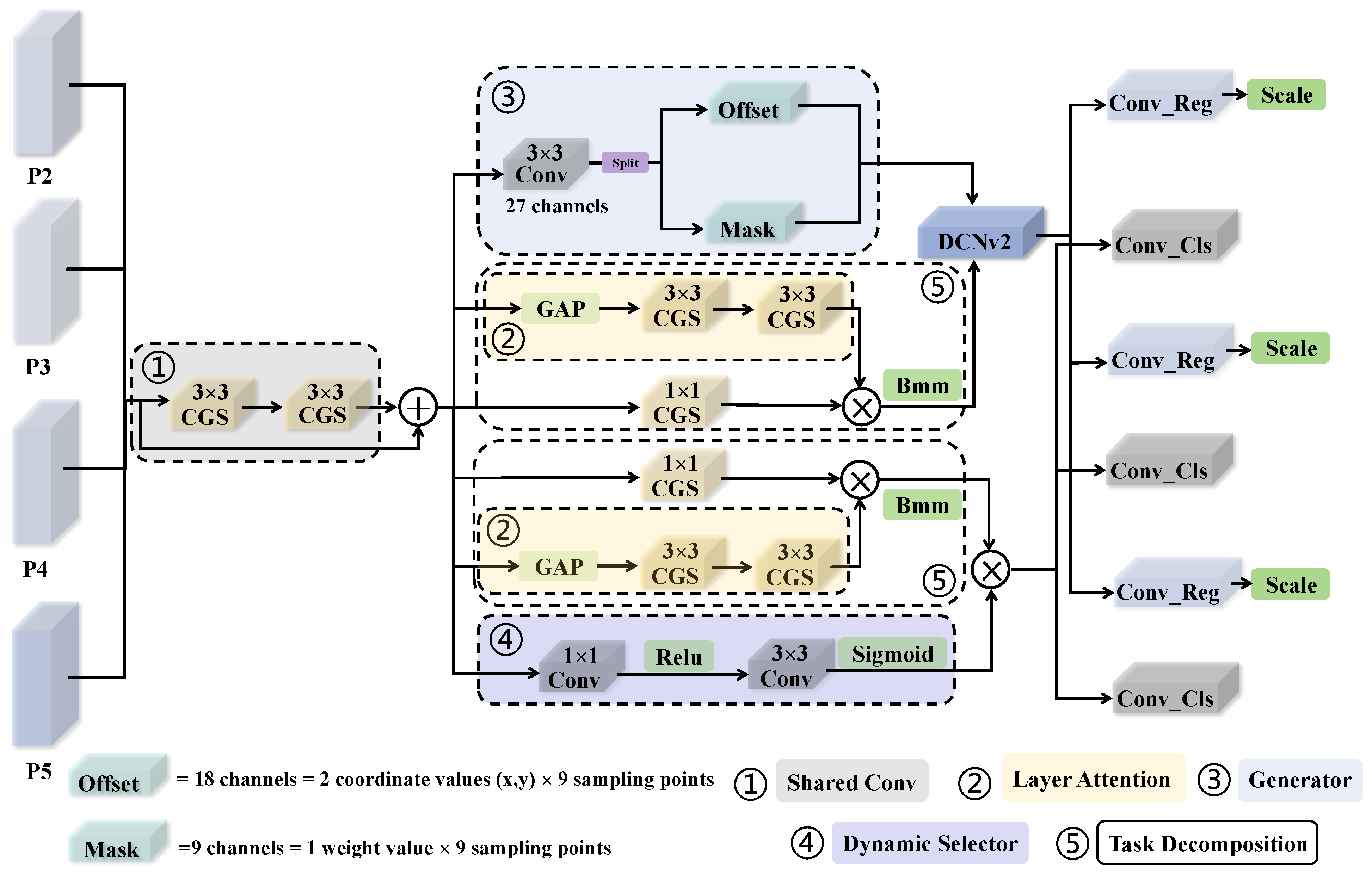 At the same time, the shared features are fed into the Task Decomposition module for feature decoupling and expression supplementation of the regression task. This module consists of two sub-paths: the main path processes the shared features through a CGS module to extract initial task features; the auxiliary path is a Layer Attention branch, which first performs Global Average Pooling (GAP) to extract global information from the shared features, and then generates guiding attention weights through two successive CGS modules. The attention weights are fused with the features from the main path through element-wise multiplication. Additionally, SDIDA-Head uses Batch Matrix Multiplication (BMM) operations to achieve efficient and low-latency computation between weights and features in the batch dimension. Ultimately, the features output by Task Decomposition are synergistically fused with the spatially dynamic sampling features from the Generator, thereby guiding DCNv2 to output more accurate regression prediction results.