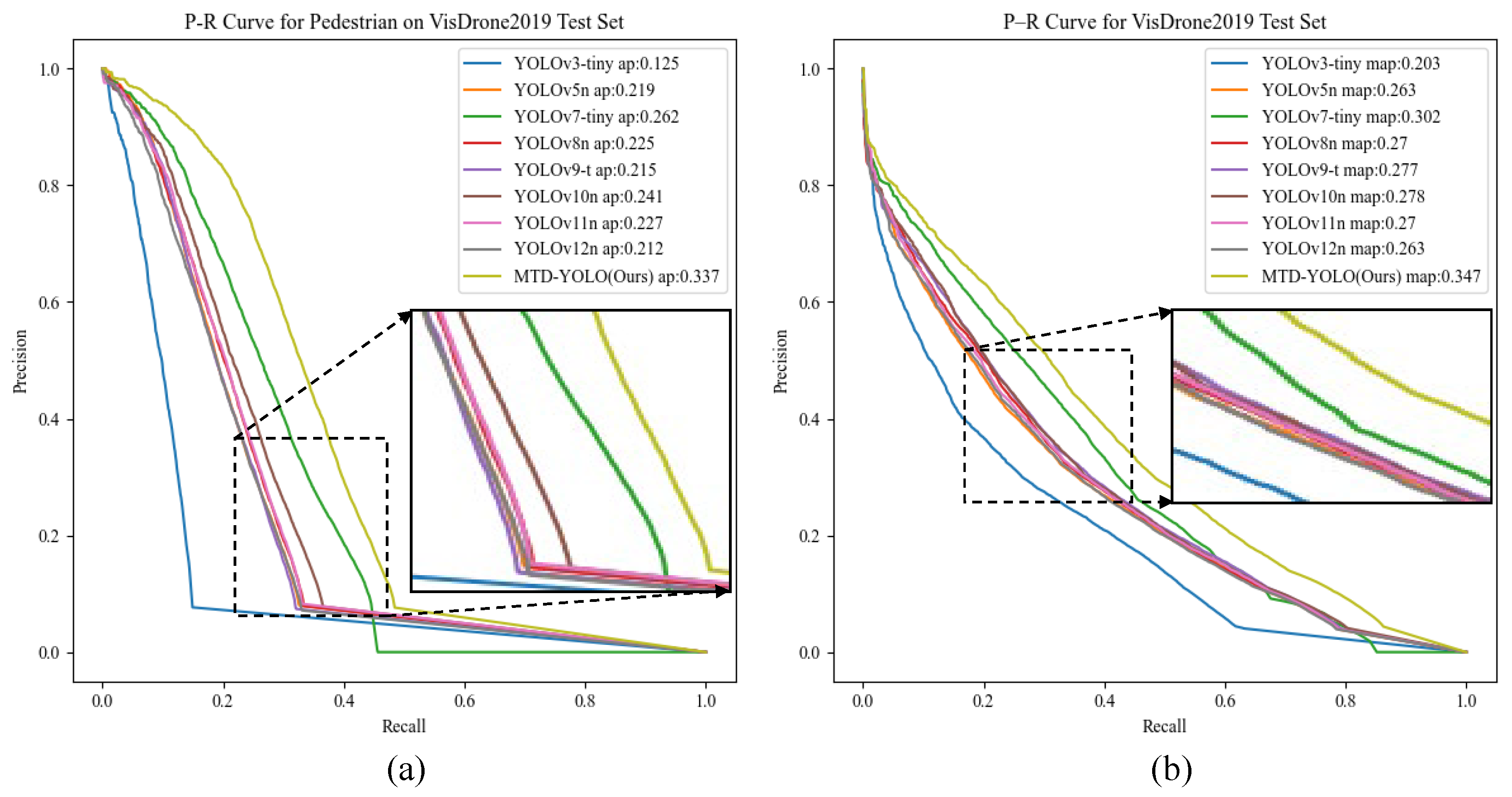 This study further plots the overall Precision-Recall (PR) curves for all models on the VisDrone2019 test set from the UAV perspective. Additionally, to provide a more fine-grained analysis of model performance, the PR curves for the representative small target category “pedestrian” in the VisDrone2019 test set are also presented, as shown in
