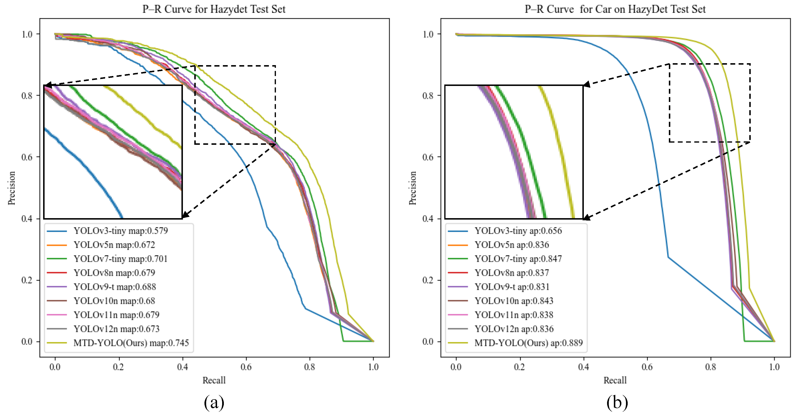 We also plotted the PR curves for all models on the HazyDet test set and for the car category, as shown in