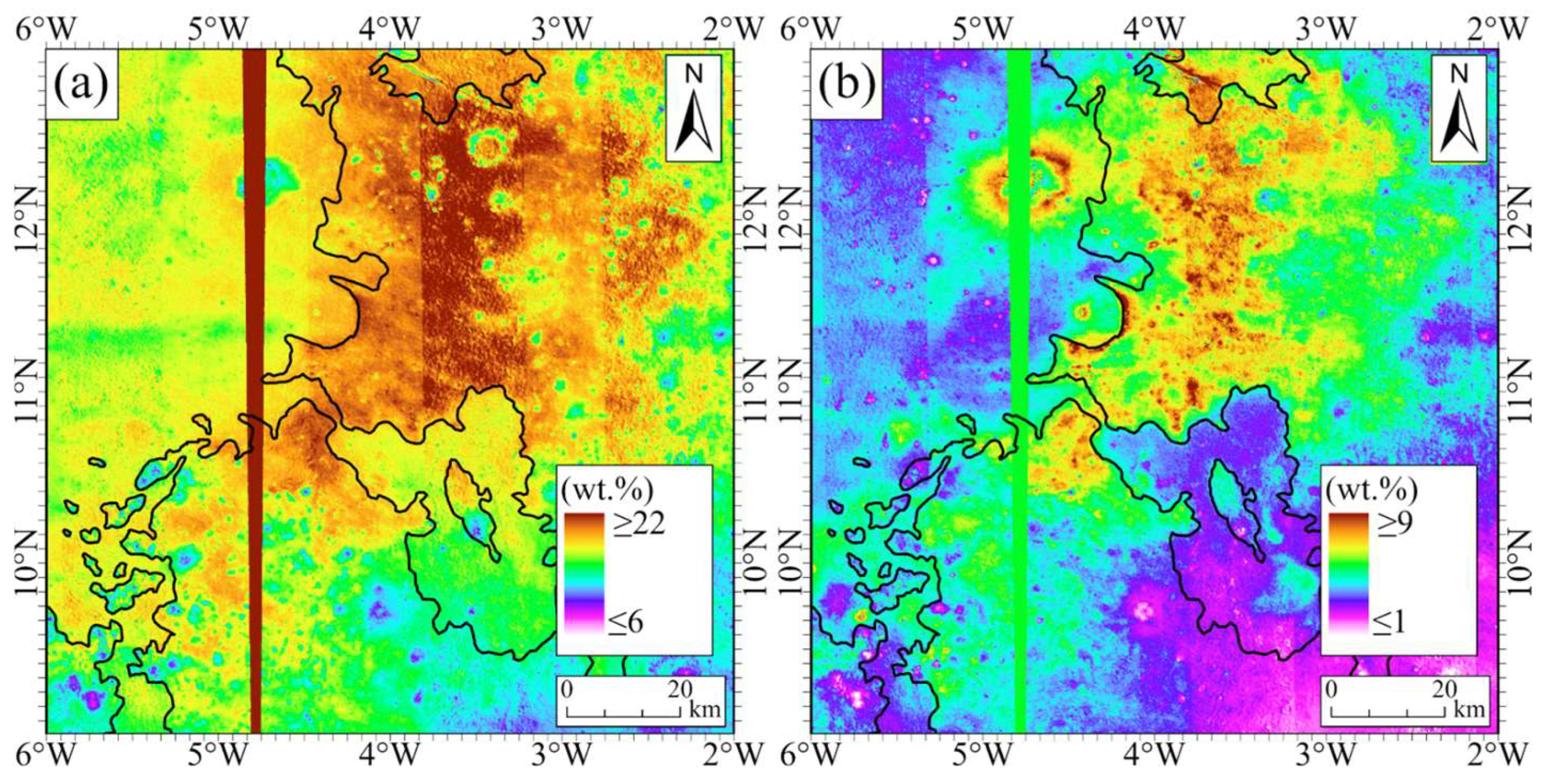 - Lucey, P.; Blewett, D.; Jolliff, B. Lunar Iron and Titanium Abundance Algorithms Based on Final Processing of Clementine Ultraviolet-Visible Images. J. Geophys. Res. Planets 2000, 105, 20297–20305. [Google Scholar] [CrossRef]