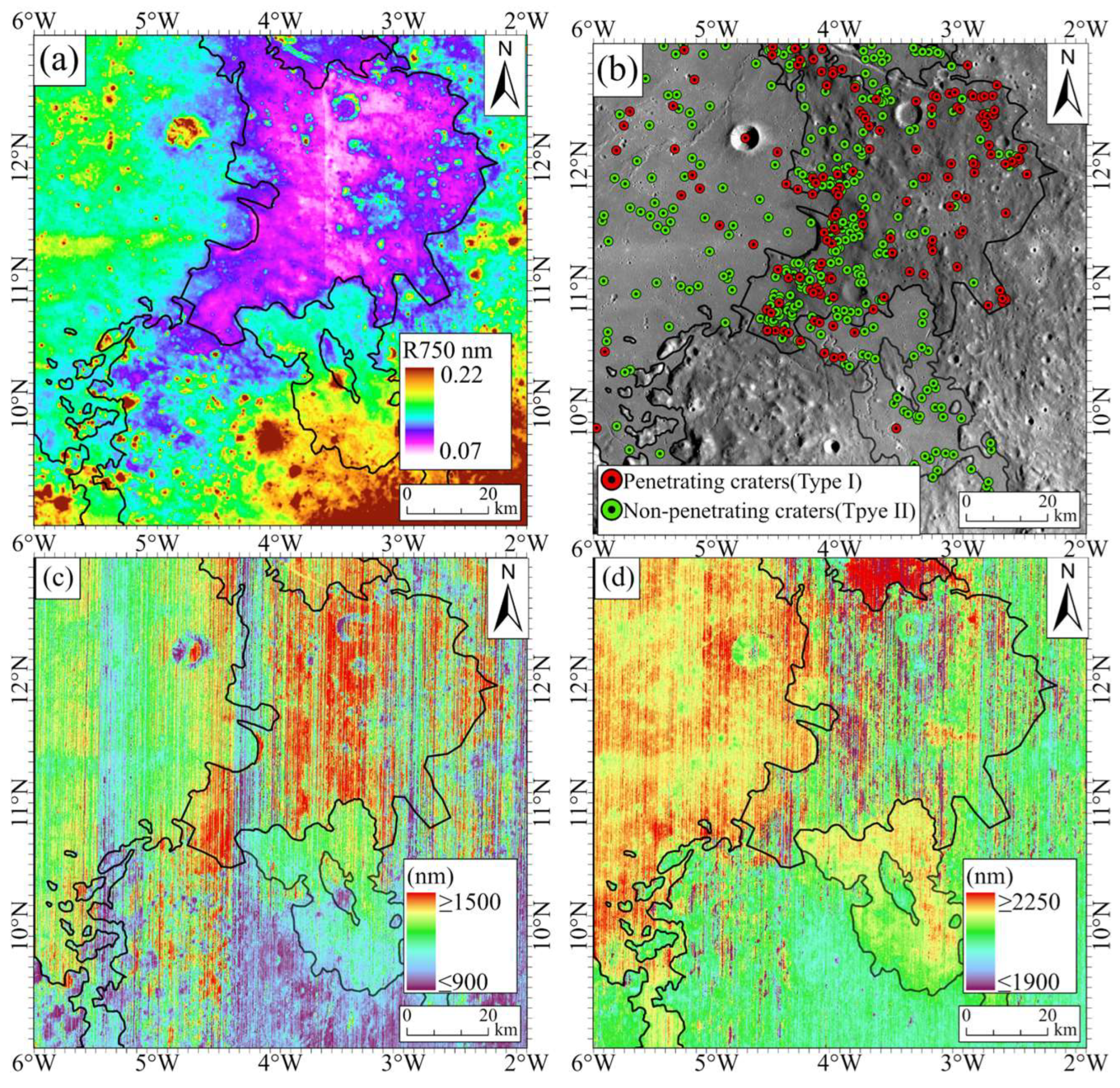 - Wu, Y.; Li, L.; Luo, X.; Lu, Y.; Chen, Y.; Pieters, C.M.; Basilevsky, A.T.; Head, J.W. Geology, Tectonism and Composition of the Northwest Imbrium Region. Icarus 2018, 303, 67–90. [Google Scholar] [CrossRef]