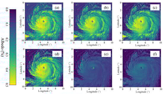 Himawari-8 visible and near-infrared channel image obtained from (a) Chanel 1; (b) Chanel 2; (c) Chanel 3; (d) Chanel 4; (e) Chanel 5; (f) Chanel 6.