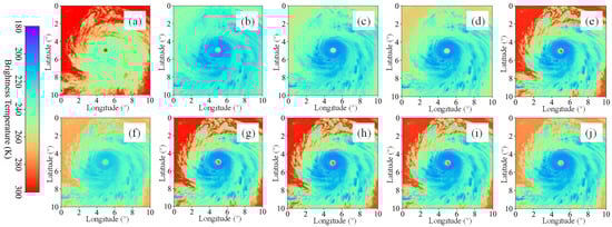 Himawari-8 infrared channel image obtained from (a) Chanel 7; (b) Chanel 8; (c) Chanel 9; (d) Chanel 10; (e) Chanel 11; (f) Chanel 12; (g) Chanel 13; (h) Chanel 14; (i) Chanel 15; (j) Chanel 16.
