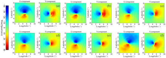 Wind field of Typhoon Chan-hom at 00:00 UTC on 7 July 2015 across different heights from ERA5: (a) 5550 m; (b) 4200 m; (c) 3000 m; (d) 2000 m (e) 1000 m; (f) 110 m.