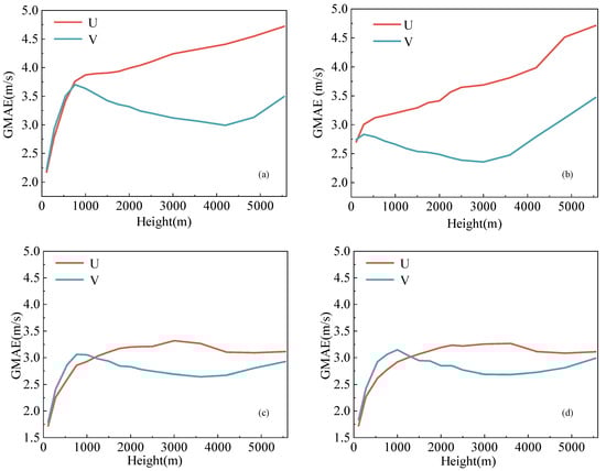 GMAE in U- and V- directions of four scenarios across different height levels: (a) B1; (b) B2; (c) B3; (d) B4.