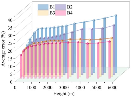 To further characterize model stability across different pressure levels, Figure 10 presents the relative error distributions of the four scenarios at each of the 16 height layers. The mean error of all schemes increased monotonically with height, peaking at 5550 m and reaching its lowest value at 110 m, indicating greater uncertainty in upper-level wind fields. In comparison, B2 consistently achieved lower errors than B1 across all heights, approximately 5% at 110 m and about 32% at 5550 m, demonstrating that the physical constraint alone reduced errors by roughly 6–8% on average. Relative to B1, B3 attained a 32.4% reduction in error at 5550 m, confirming that visible channels also contributed to retrieval accuracy. B4 consistently yielded the lowest errors across all layers: its performance at 110 m was comparable to the other models, while at 5550 m it achieved an error of about 24%. These results highlight the ability of multispectral data to reduce overall errors and the particular role of physical constraints in mitigating errors at higher altitudes. Overall, B4 maintained the lowest mean error and the smallest inter-layer variability across all pressure levels, verifying that the integration of visible channels and continuity equation constraints improved both the accuracy and vertical consistency of 3D wind field retrievals in a top-down manner.