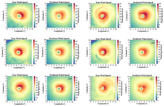 Table 4 compares the performance of different loss functions for retrieving the 10 m wind field using satellite infrared channel data. As shown in the table, the average errors differ only slightly among the four loss functions, with the RMSE-based loss yielding the largest errors in the U and V components. However, when the wind speed range is increased to above 20 m/s, the differences become markedly pronounced: the custom loss function achieves U and V component errors of 3.83 m/s and 4.01 m/s, respectively, which are significantly lower, by over 20%, than those of MSE and RMSE. Compared with MAE, the custom loss also maintains an advantage of approximately 5%. This indicates that MSE and MAE tend to balance errors across the entire field, whereas the exponential weighting in the proposed loss function amplifies the penalty for high-wind-speed errors, thereby substantially improving the retrieval accuracy of strong winds in the typhoon core region.