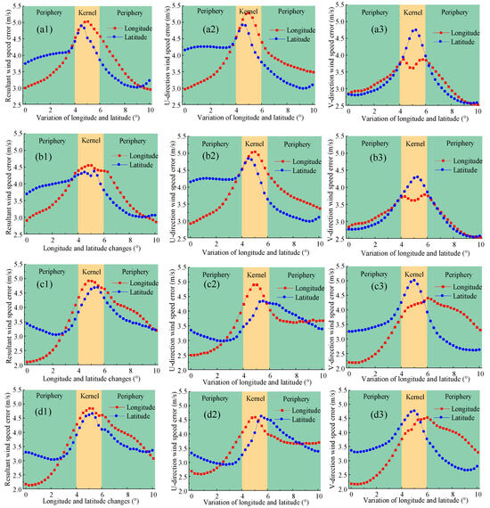 Error distribution along longitude and latitude directions: (a1) resultant wind speed of B1 scenario; (a2) U-direction wind speed of B1 scenario; (a3) V-direction wind speed of B1 scenario; (b1) resultant wind speed of B2 scenario; (b2) U-direction wind speed of B2 scenario; (b3) V-direction wind speed of B2 scenario; (c1) resultant wind speed of B3 scenario; (c2) U-direction wind speed of B3 scenario; (c3) V-direction wind speed of B3 scenario; (d1) resultant wind speed of B4 scenario; (d2) U-direction wind speed of B4 scenario; (d3) V-direction wind speed of B4 scenario.
