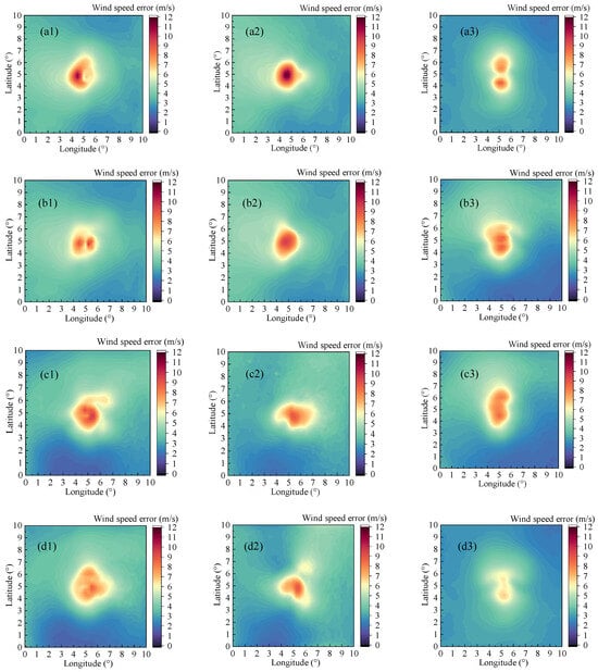Spatial distribution of error in: (a1) resultant wind speed of B1 scenario; (a2) U-direction wind speed of B1 scenario; (a3) V-direction wind speed of B1 scenario; (b1) Resultant wind speed of B2 scenario; (b2) U-direction wind speed of B2 scenario; (b3) V-direction wind speed of B2 scenario; (c1) resultant wind speed of B3 scenario; (c2) U-direction wind speed of B3 scenario; (c3) V-direction wind speed of B3 scenario; (d1) resultant wind speed of B4 scenario; (d2) U-direction wind speed of B4 scenario; (d3) V-direction wind speed of B4 scenario.