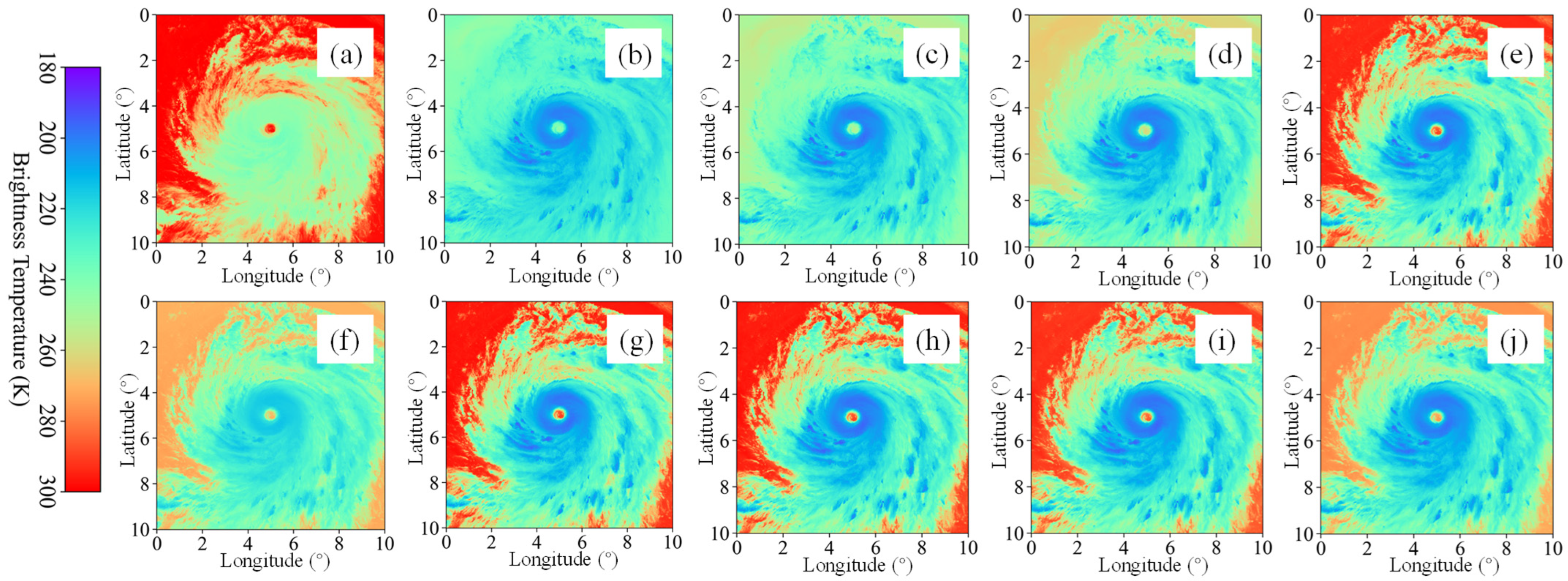 Himawari-8 infrared channel image obtained from (a) Chanel 7; (b) Chanel 8; (c) Chanel 9; (d) Chanel 10; (e) Chanel 11; (f) Chanel 12; (g) Chanel 13; (h) Chanel 14; (i) Chanel 15; (j) Chanel 16.