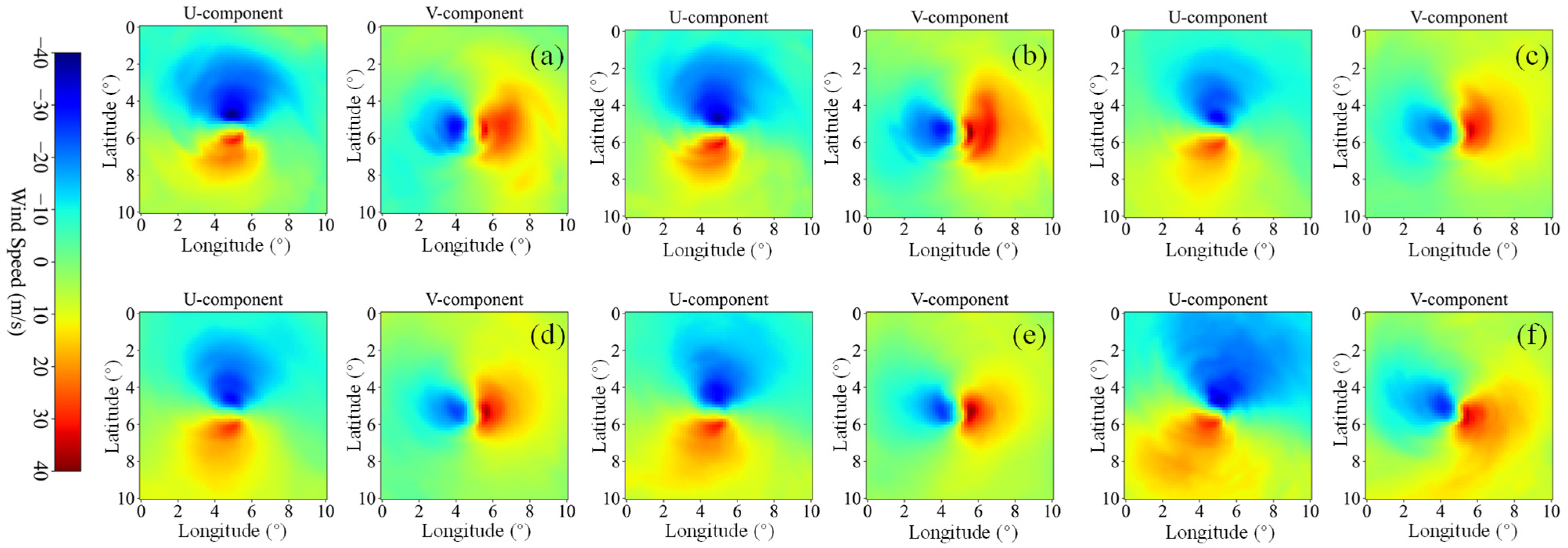 Figure 3 presents the horizontal wind field from the ERA5 reanalysis dataset at six representative height levels, clearly revealing the vertical stratification of the typhoon’s 3D wind structure. A comparison of the wind fields across different heights demonstrates the variation in wind speed and direction with altitude.