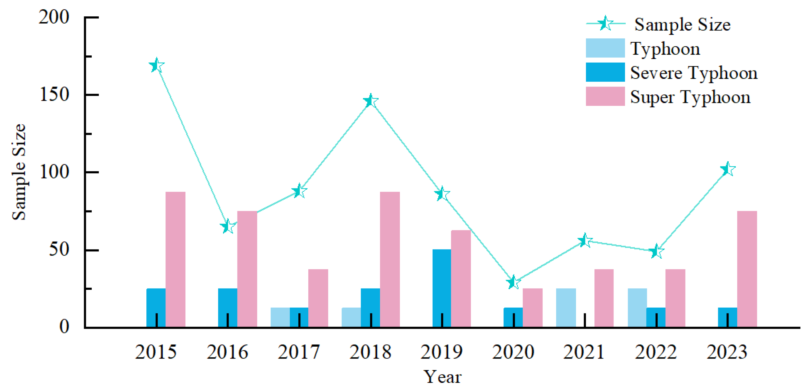 A total of 790 representative typhoons over the Northwest Pacific from 2015 to 2023 were selected as the total dataset for this study. To ensure the model learns from well-developed vortex structures, our dataset specifically samples from typhoon systems that have reached an intensity of ‘Typhoon’ or higher (Level 4 and above) according to the CMA classification, encompassing ‘Typhoon’, ‘Severe Typhoon’, and ‘Super Typhoon’ categories. The distribution of the maximum sustained wind speed (MSW) from the CMA best-track dataset for all samples is provided in