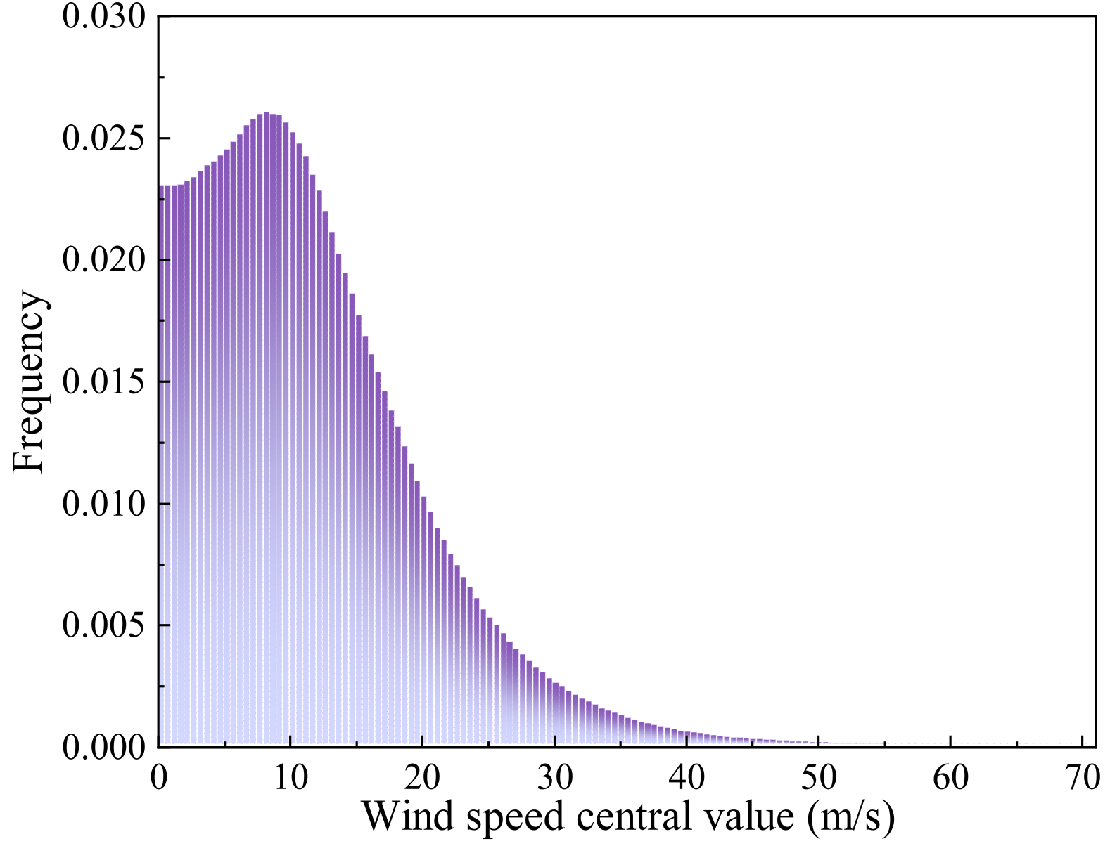 Figure 5 depicts the distribution of the processed reanalysis wind speeds, with the horizontal axis showing the wind speed and the vertical axis showing its frequency of occurrence. The dataset primarily covers wind speeds ranging from 0 to 40 m/s, reflecting the comprehensive statistical characteristics of 790 typhoon samples over the Northwest Pacific. It is important to note that this histogram represents the frequency of wind speed values across all samples and locations, not an upper limit for the model. The model is trained on and capable of predicting higher wind speeds, as evaluated in