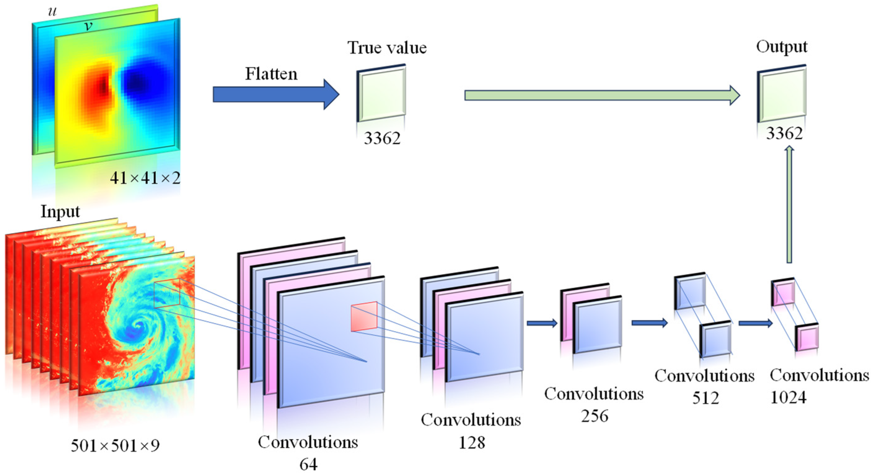 The core capability of the proposed CNN architecture lies in its ability to learn the complex, non-linear statistical relationships and physical associations between multi-channel satellite-observed cloud-top features and the three-dimensional wind field structures provided by ERA5 as labels. Through extensive training on a large dataset of typhoon cases, the deep convolutional layers hierarchically extract spatial patterns from the satellite imagery that are diagnostically linked to the underlying dynamic processes governing the wind field from the surface up to 5550 m.