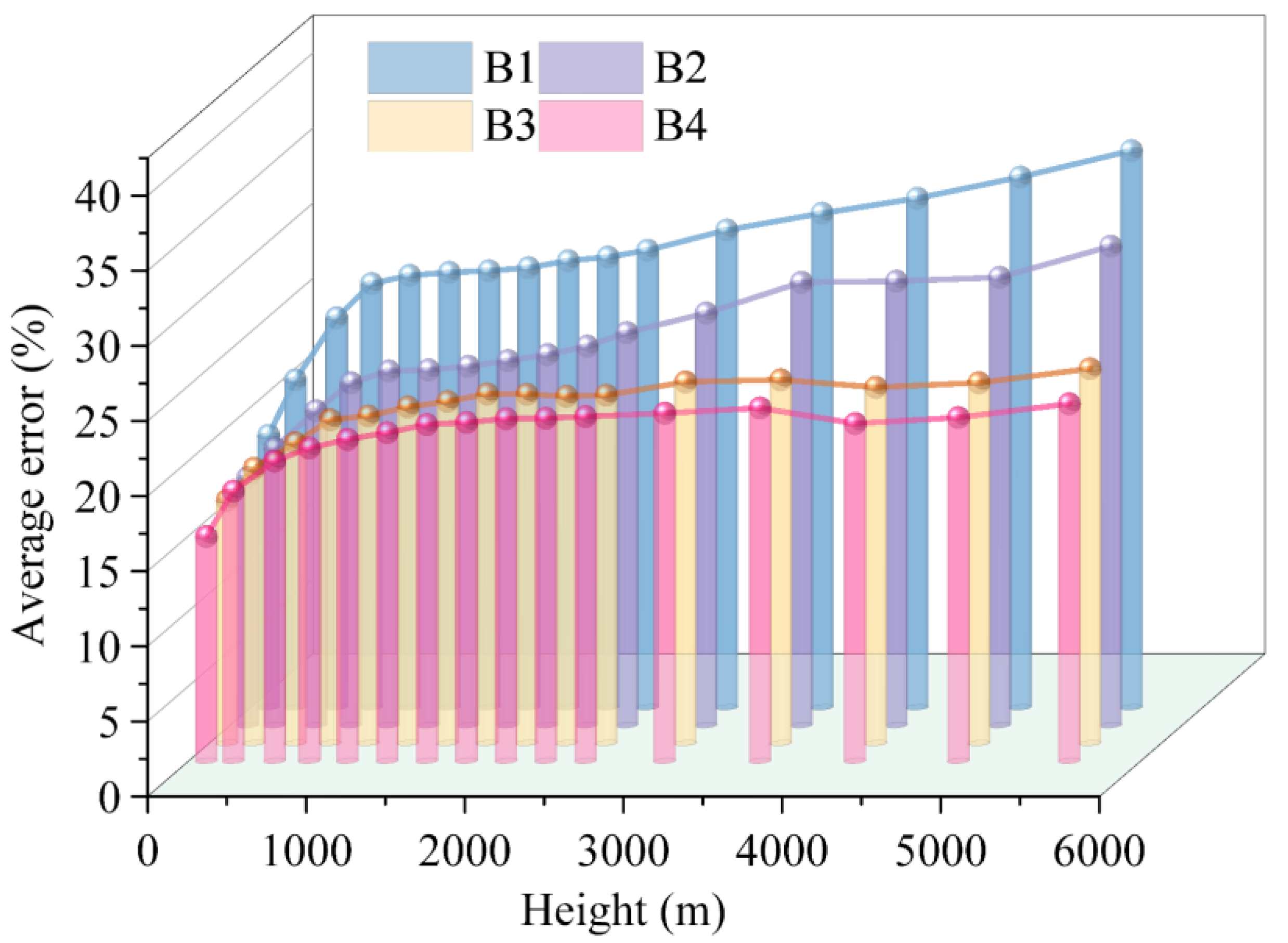 GMAE in U- and V- directions of four scenarios across different height levels: (a) B1; (b) B2; (c) B3; (d) B4.