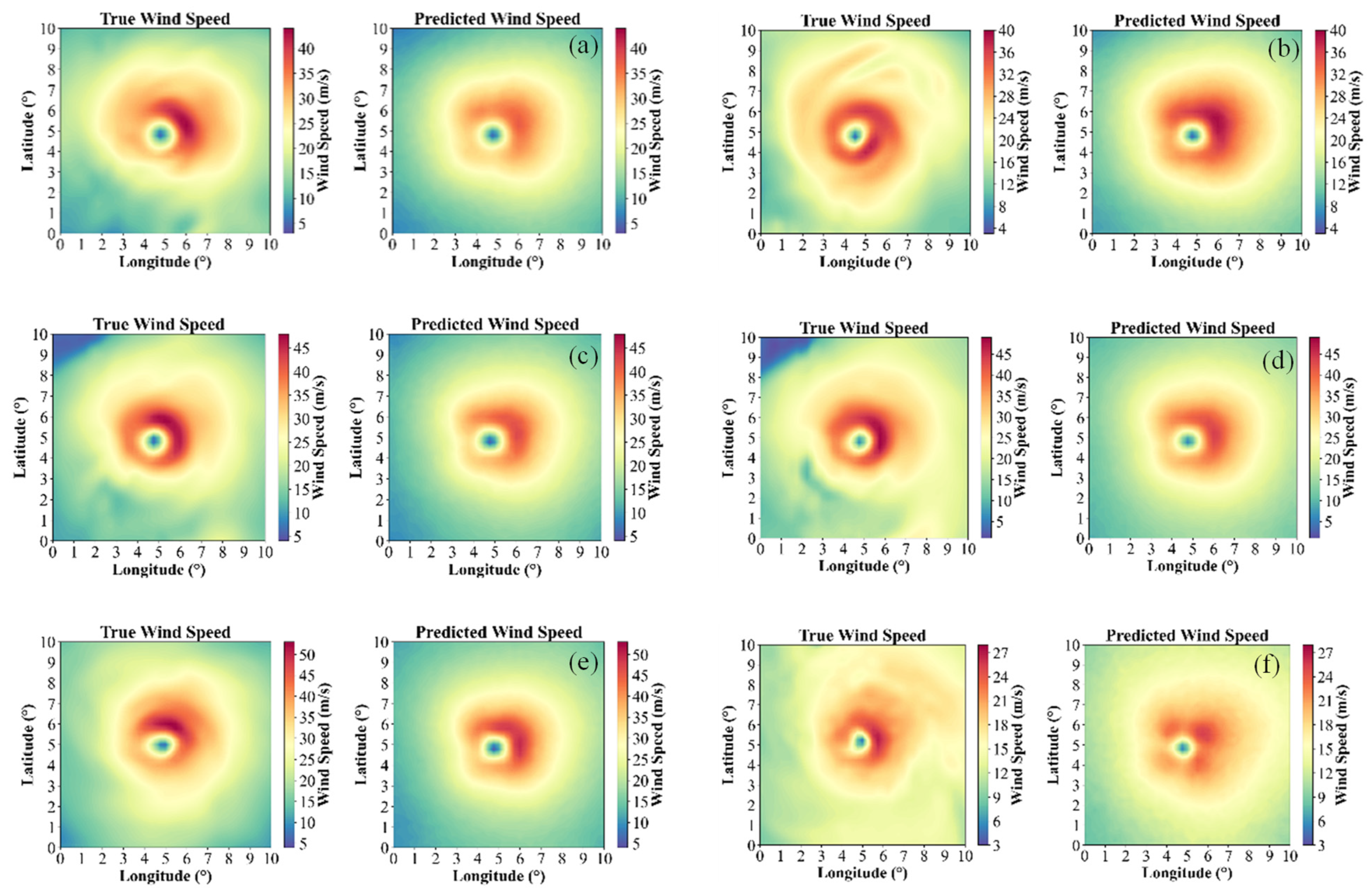 To standardize the spatial scale and structure, both the satellite and ERA5 datasets were re-gridded onto a typhoon-centred coordinate system, generating 3D wind field samples covering a 10° × 10° area with a spatial grid of 41 × 41 pixels and 16 vertical levels. This grid configuration provides sufficient spatial detail to resolve the macroscopic structure of key typhoon features such as the eyewall and spiral rainbands for the purpose of error analysis, which is conducted by comparing model predictions directly against the ERA5 wind fields on this common grid. The typhoon centre positions were obtained from the China Meteorological Administration (CMA) best-track dataset [
