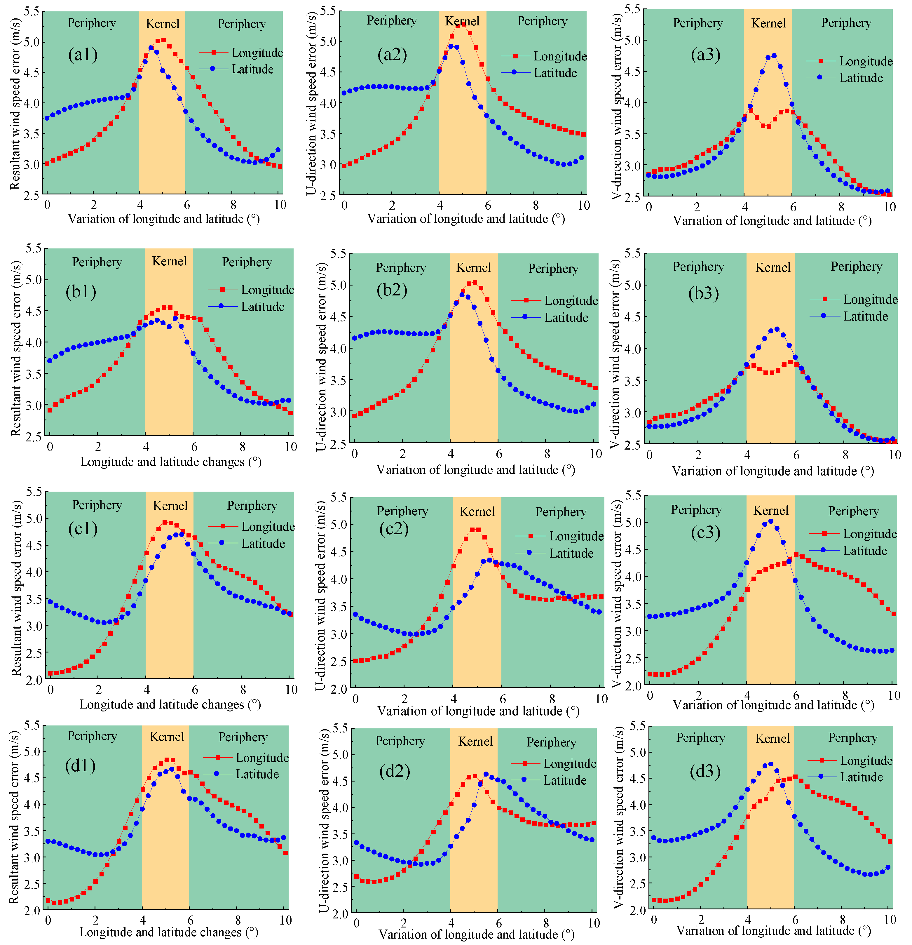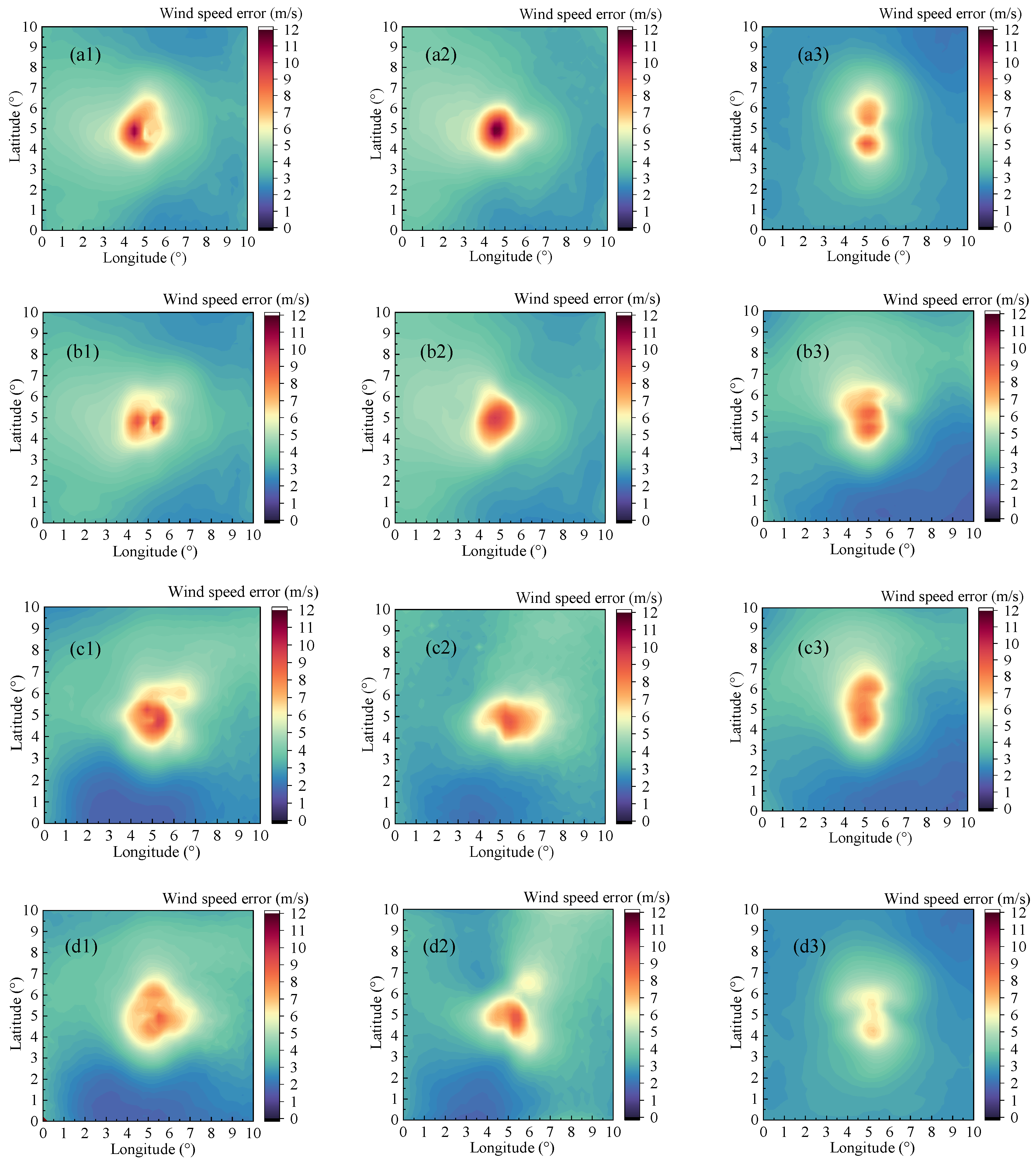Error distribution along longitude and latitude directions: (a1) resultant wind speed of B1 scenario; (a2) U-direction wind speed of B1 scenario; (a3) V-direction wind speed of B1 scenario; (b1) resultant wind speed of B2 scenario; (b2) U-direction wind speed of B2 scenario; (b3) V-direction wind speed of B2 scenario; (c1) resultant wind speed of B3 scenario; (c2) U-direction wind speed of B3 scenario; (c3) V-direction wind speed of B3 scenario; (d1) resultant wind speed of B4 scenario; (d2) U-direction wind speed of B4 scenario; (d3) V-direction wind speed of B4 scenario.