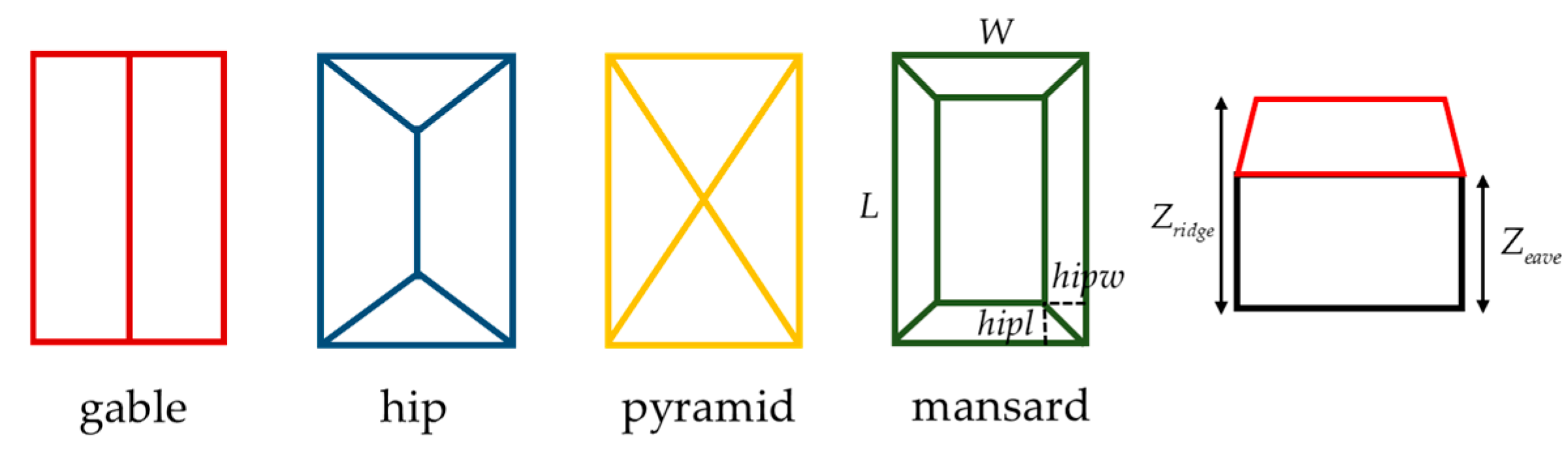 - Qian, Y.; Zhang, H.; Furukawa, Y. Roof-GAN: Learning to Generate Roof Geometry and Relations for Residential Houses. In Proceedings of the 2021 IEEE/CVF Conference on Computer Vision and Pattern Recognition (CVPR), Nashville, TN, USA, 20–25 June 2021; pp. 2796–2805. [Google Scholar]