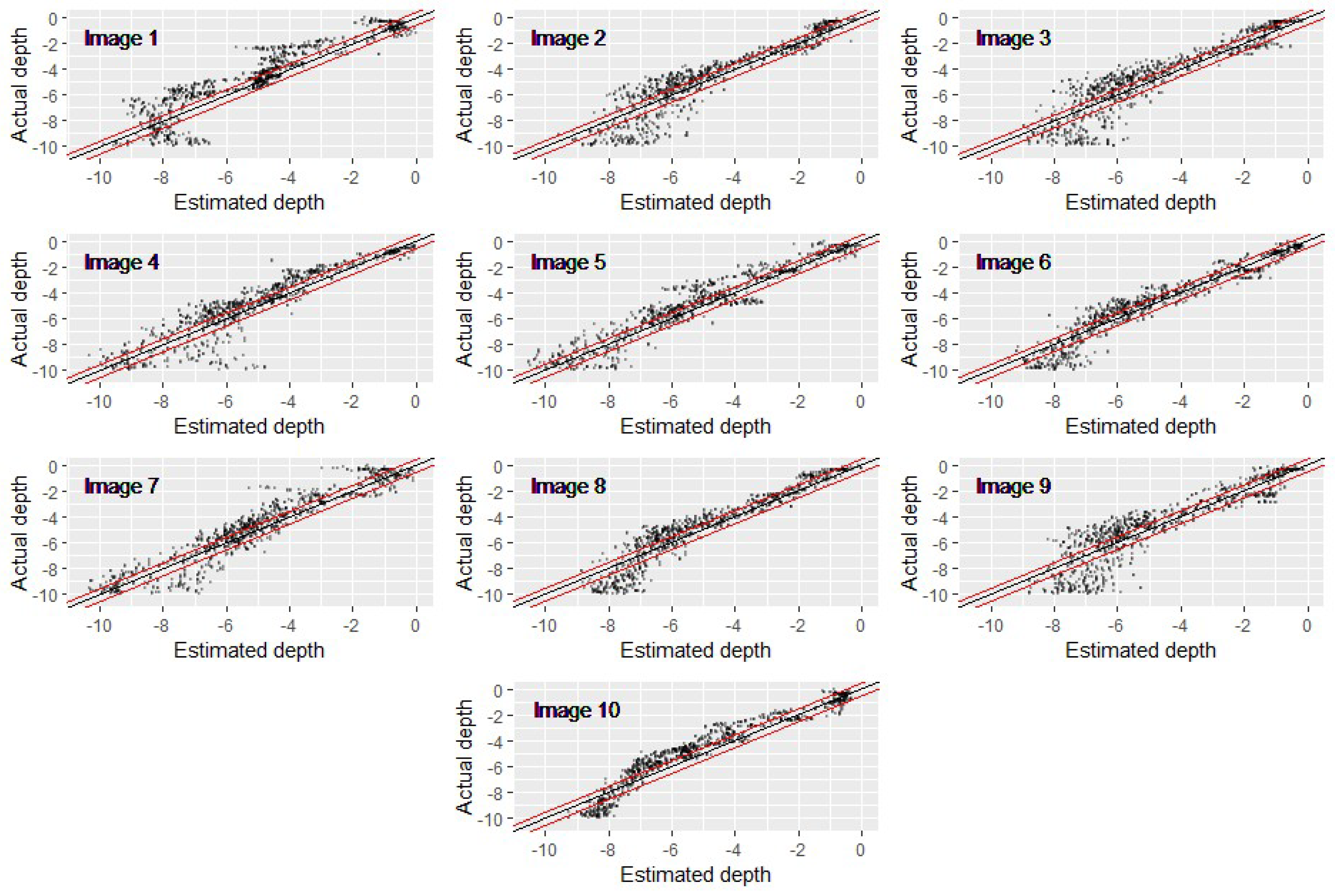 The validation results for the three tested SDB models are presented for the ten analysed images (Table 3). Lyzenga’s R2 coefficients ranged between 0.79 and 0.89 and were, on average, 31% higher than those obtained by applying Stumpf’s model (mean 0.85 vs. 0.65), which ranged between 0.35 and 0.82. Lyzenga’s models showed lower WRS values than Stumpf’s models for all the images. Lower RMSE and MAE values were also achieved for Lyzenga’s models, with an average improvement over Stumpf’s of 0.57 m and 0.46 m, respectively. The highest accuracy scores were achieved when Lyzenga’s model was applied to image IDs 6, 7, and 8, which were obtained within the same week of July 2021. These three images had the highest R2 values (0.88–0.89) and the lowest RMSE and among the lowest MAE values of all the images. Conversely, these three images did not show consistent scores when Stumpf’s model was applied, with R2 values ranging from 0.47 to 0.75. Image ID 1 exhibited the largest variation between the two models, with an increase in the RMSE of around 1.2 m, and the coefficient of determination R2 dropped to 35% when using Stumpf’s model, which was the lowest value among all the analysed images.