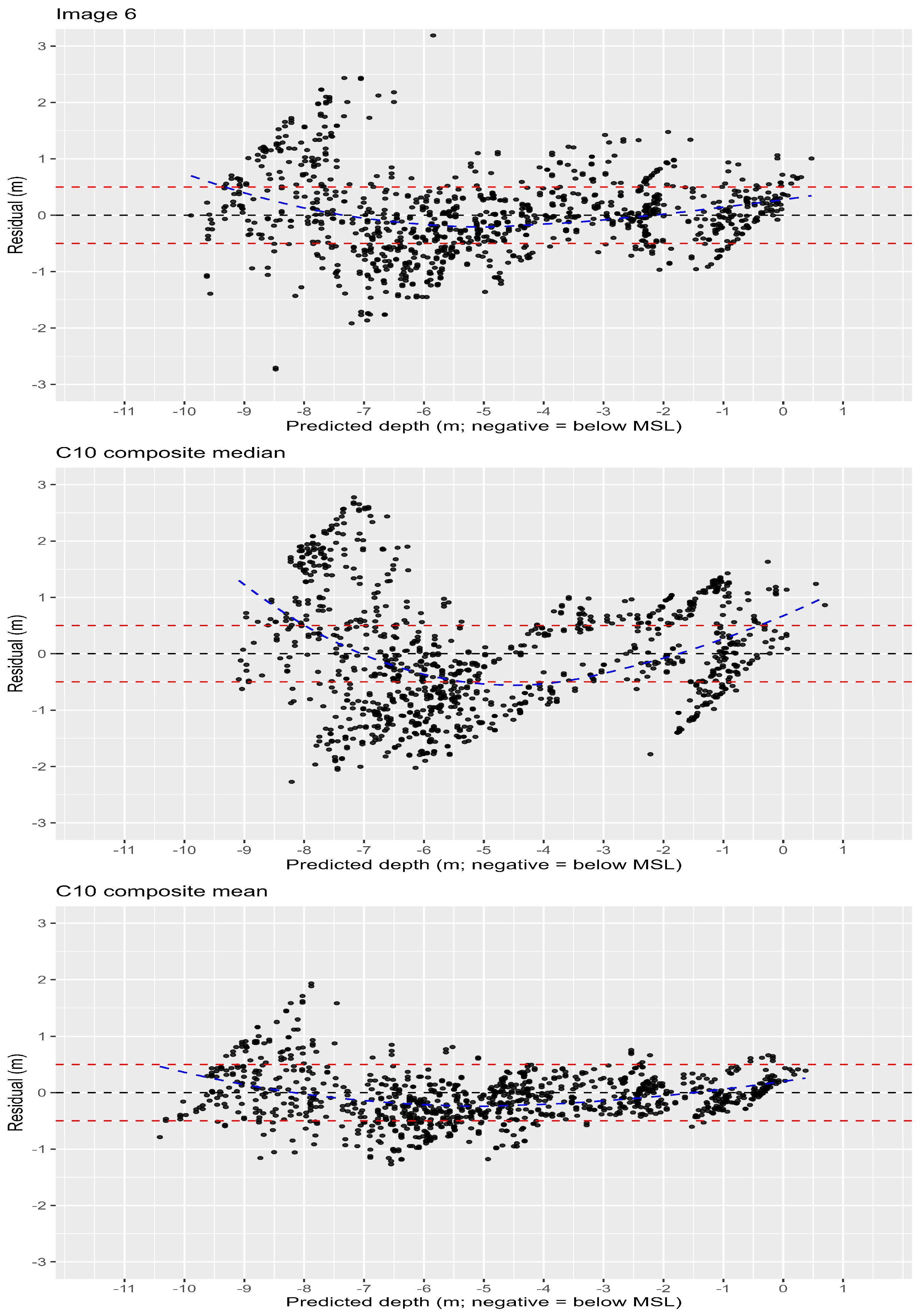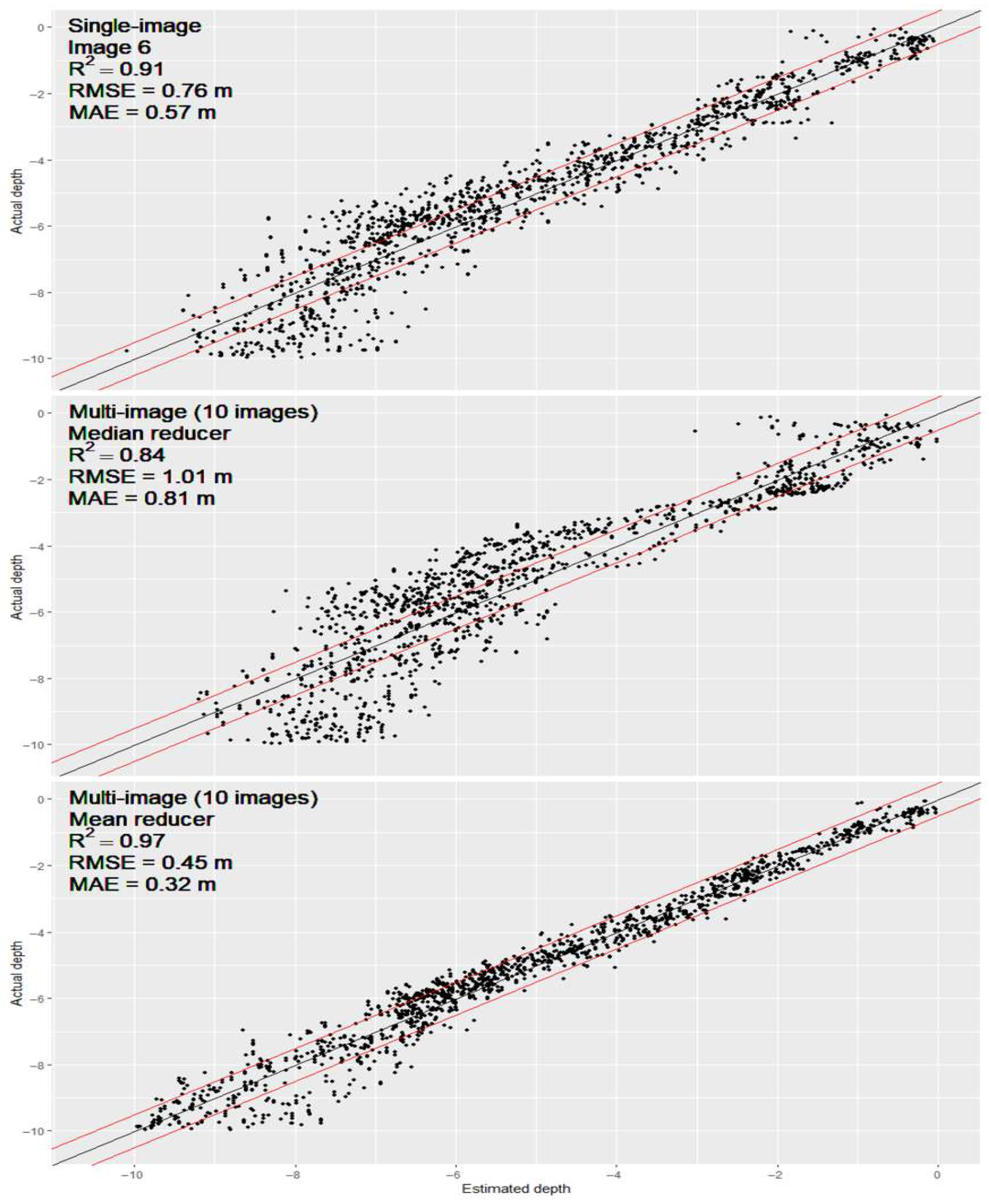 Ref. [16] proposed a different approach to SDB, in which the estimated depth was obtained from a linear relationship with the ratio of log-transformed reflectance bands: