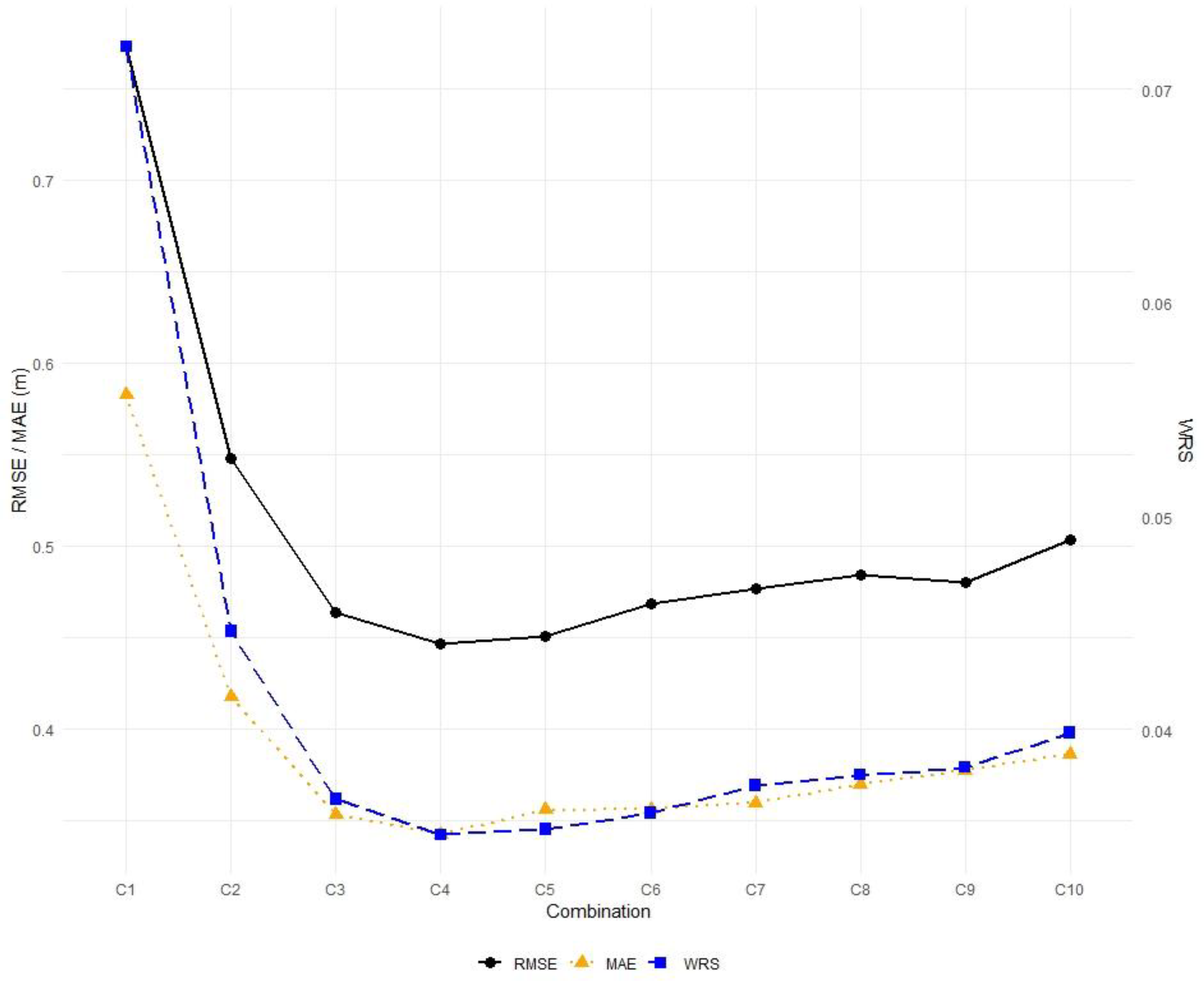 Figure 5. Trends across the best GLM combinations at each subset size (C1 to C10). For each k (1 to 10 images), the combination with the minimum MAE was selected. RMSE and MAE (m) use the left axis; WRS uses the right (see Section 2.5; lower is better). C10 denotes the all-images composite.