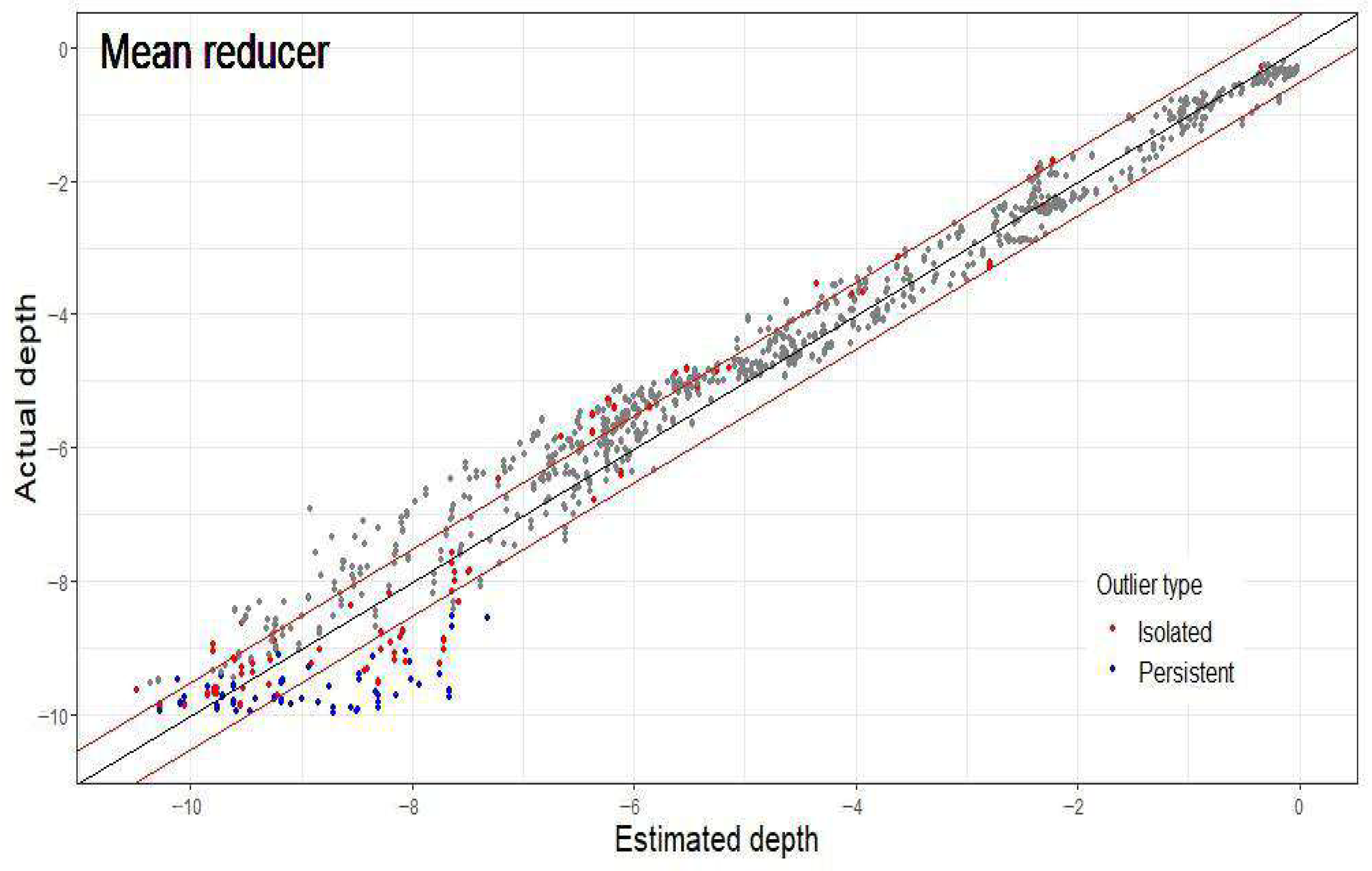 Figure 6. Distribution of Isolated outliers (red) and Persistent outliers (blue) in the results of the mean-reduced multi-image analysis using all 10 images. All other points that were not classified as outliers are coloured grey. The black line represents the identity line where the estimated and actual depths coincide, and the red lines represent the ±0.5 m error limits.