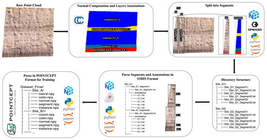 The pre-processing of 3D point cloud data involved several steps to ensure efficient training and segmentation of the rock lithology. An overview of the detailed data pre-processing pipeline is presented in Figure 2.