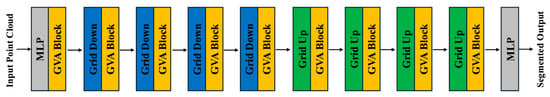 PTv2 builds upon the original Point Transformer by improving scalability and spatial representation through Grouped Vector Attention (GVA) and enhanced positional encoding []. GVA divides feature channels into shared-attention groups, reducing the number of learnable parameters and improving generalisation. To better capture geometric structure, PTv2 introduces a multiplicative position encoding mechanism, which enhances spatial awareness beyond simple bias terms. Additionally, a partition-based pooling strategy replaces conventional sampling methods, aggregating features within fixed spatial partitions. This design improves computational efficiency while preserving local structure, making PTv2 effective for complex 3D scene understanding. Figure 6 shows the basic architecture for the PTv2 model.