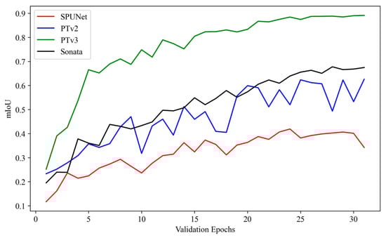 Validation mIoU curves of the trained 3D segmentation models for rock lithology segmentation.