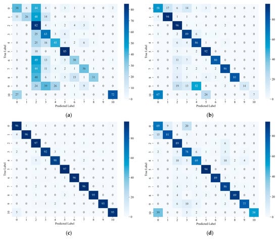 Confusion matrices of the trained 3D segmentation models for rock lithology segmentation: (a) SPUNet, (b) PTv2, (c) PTv3, and (d) Sonata.