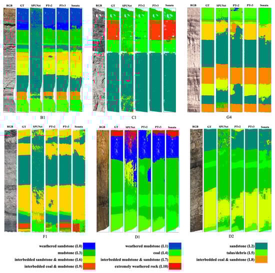Quantitatively, the PTv3 model achieved a mIoU of 0.8912 and a mAcc of 0.9497, outperforming the second-best model, Sonata, by 21% in mIoU and 15% in mAcc (see Table 5). In terms of per-class performance, for the best-performing model (i.e., PTv3), the highest IoU values are observed for weathered mudstone (L1), sandstone (L2), and debris (L5), with scores of 0.9521, 0.9438, and 0.9342, respectively. In contrast, the lowest IoU values are recorded for coal (L4) and weathered sandstone (L0), with scores of 0.8090 and 0.8390, respectively.