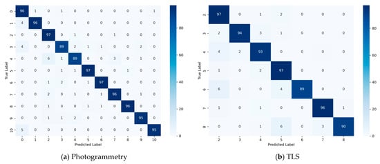The performance of the PTv3 model was further evaluated on separate photogrammetry and TLS validation dataset splits to assess the impact of different data acquisition sources. Figure 14 presents the confusion matrices for both splits. Overall, the model demonstrated slightly better and more stable performance on the photogrammetry data compared to the TLS data. Specifically, the photogrammetry results followed the trend observed in the combined confusion matrix, with the lowest accuracy for L3 and L4, and with L4 frequently misclassified as L2. In contrast, the TLS validation data exhibited the highest misclassification rates for interbedded sandstone & mudstone (L6) and interbedded coal & sandstone (L8). L6 was often misclassified as talus/debris (L5) or sandstone (L2), while L8 was frequently misclassified as L5. These misclassifications can be attributed to the characteristics of TLS scans and the geological nature of the layers. TLS primarily captures geometric and structural features (e.g., 3D shape, surface roughness) and records intensity-based pseudo-RGB values that differ from true colour imagery, generally exhibiting lower quality than photogrammetric data. Interbedded layers like L6 and L8 have heterogeneous compositions and fine stratification, which can be smoothed or underrepresented in TLS point clouds, causing them to resemble simpler layers. Additionally, the surface geometries of these interbedded layers may be similar to unconsolidated debris (L5), and the emphasis on one material over another due to surface exposure or scan orientation may further contribute to confusion with L2 or L5. By contrast, photogrammetry provides higher-quality RGB information that enhances the distinction of interbedded layers, reducing misclassifications. The slightly better performance on photogrammetry data can be attributed to both the higher-quality RGB information, which improves material layer discrimination, and the fact that the dataset contains many more photogrammetry sites than TLS sites, introducing a potential imbalance.