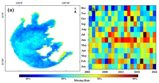 Missing rate of MODIS images for Lake Taihu (2003–2023): (a) Spatial missing rate, (b) temporal missing rate.