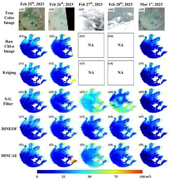 Comparison of reconstructed Chl-a concentration results from different methods under the algal bloom scenario: (a1–a5) true-color image from MODIS; (b1–b5) raw Chl-a concentration image from MODIS; (c1–c5) reconstructed Chl-a concentration using Kriging Interpolation; (d1–d5) reconstructed Chl-a concentration using SG Filtering; (e1–e5) reconstructed Chl-a concentration using DINEOF; (f1–f5) reconstructed Chl-a concentration using DINCAE.