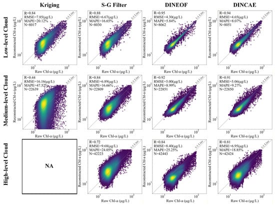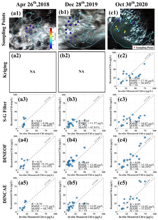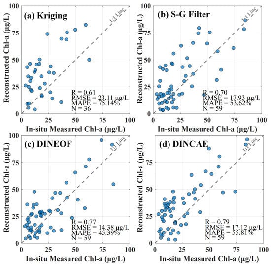 To further quantitatively validate the accuracy of the reconstruction algorithms, cloud-affected remote sensing imagery was compared with synchronous in situ sampling data (Figure 8). The results demonstrated that both DINEOF and DINCAE achieved the highest reconstruction accuracy, yielding the strongest correlations (R = 0.77 and 0.79) and the lowest errors (RMSE = 14.38 and 17.12 μg/L), highlighting their superiority in recovering missing data. In contrast, the Kriging interpolation and SG Filtering methods exhibited relatively lower accuracy (R = 0.61, RMSE = 23.11 μg/L; R = 0.70, RMSE = 17.93 μg/L).