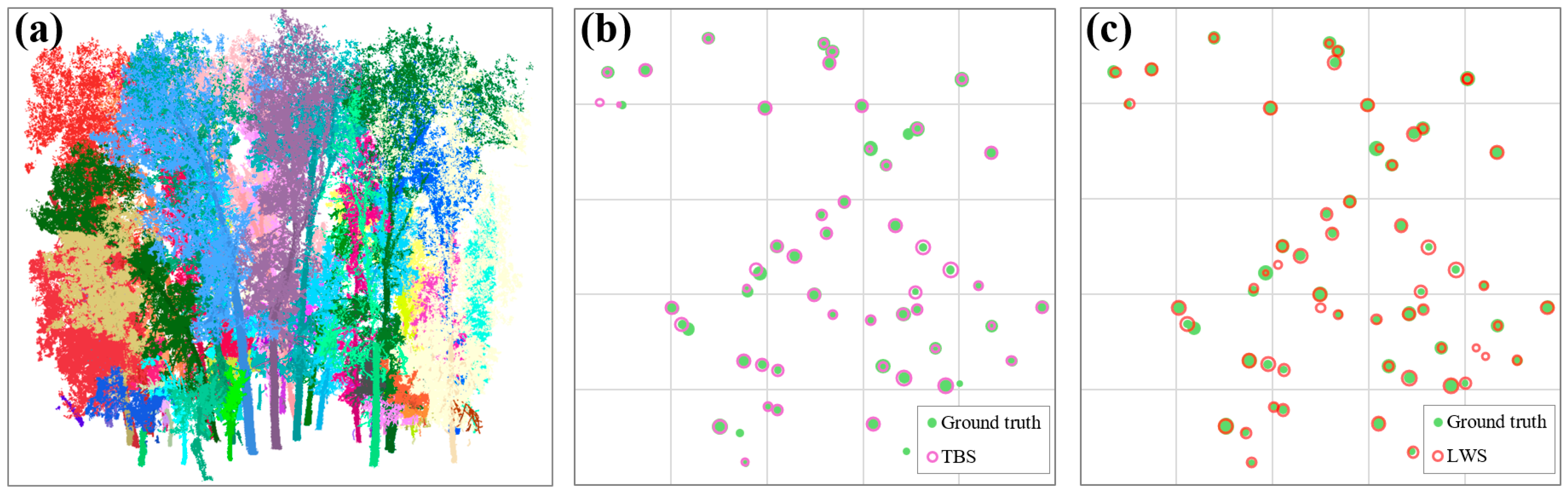 - SPS method: Seed-point segmentation (SPS) generates seeds at breast height. Heights are first normalized to the ground (Figure 4c). A thin horizontal slice at 1.3 m is then extracted. Stem cross-sections are detected using the circular Hough transform [47]. For each detected stem, the center of the circle defines the seed location. The estimated radius initializes the neighborhood. Using the 3D coordinates of these seeds, points within the DBH-based radius—or the nearest point if the slice is sparse—are assigned as the initial seed cluster. This cluster is subsequently grown to delineate the full individual tree. The algorithm searches for points within the DBH-based radius—or the nearest available points when the slice is sparse—around the 3D seed coordinates to form the initial seed-point cluster for subsequent segmentation. In our approach, a clustering threshold of 0.2 m was applied for segmentation.