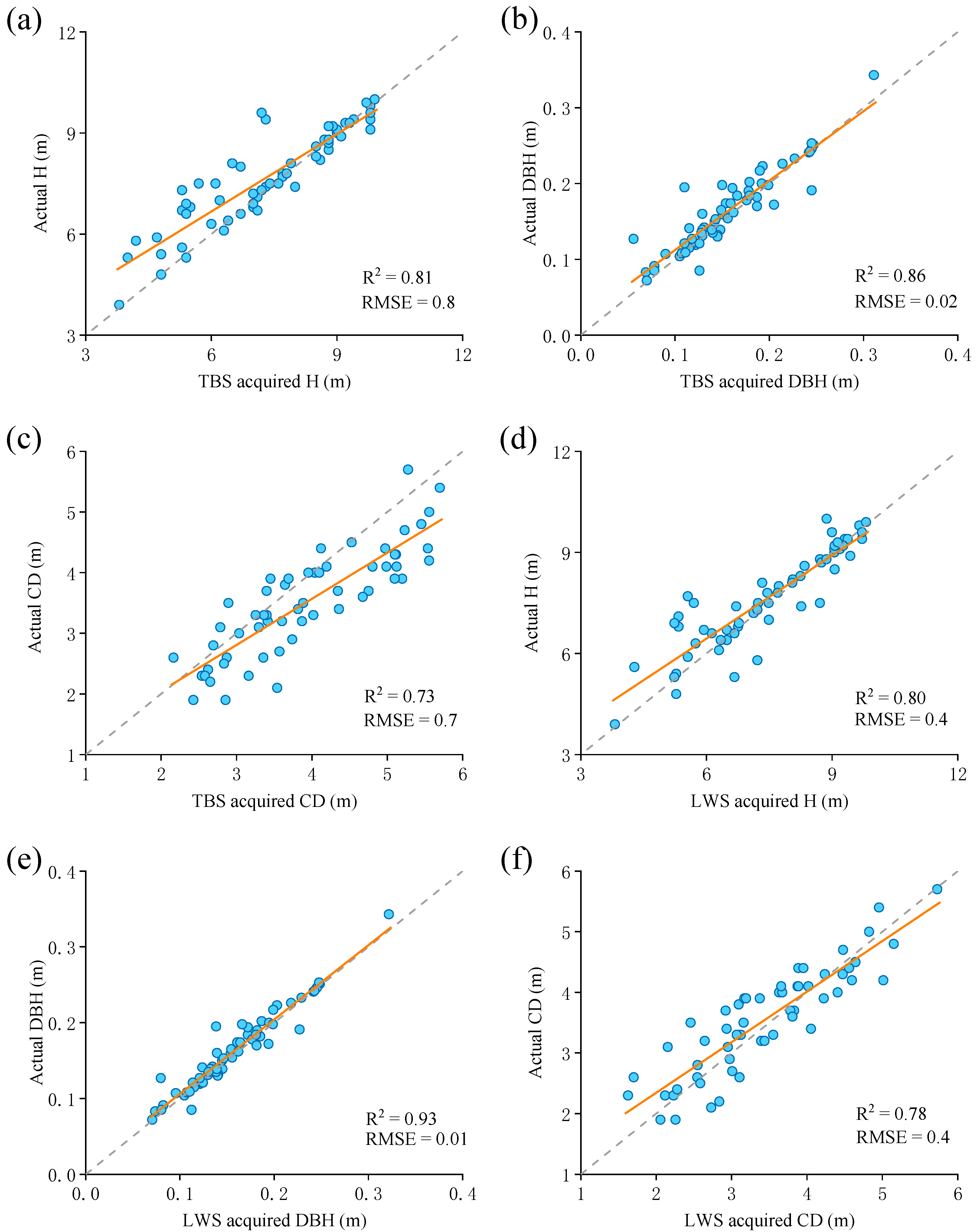 | Plot | Size (m2) | Number of Trees | Stand Density (n/hm2) | Min/Max DBH (cm) | Min/Max H (m) | Number of Scans |