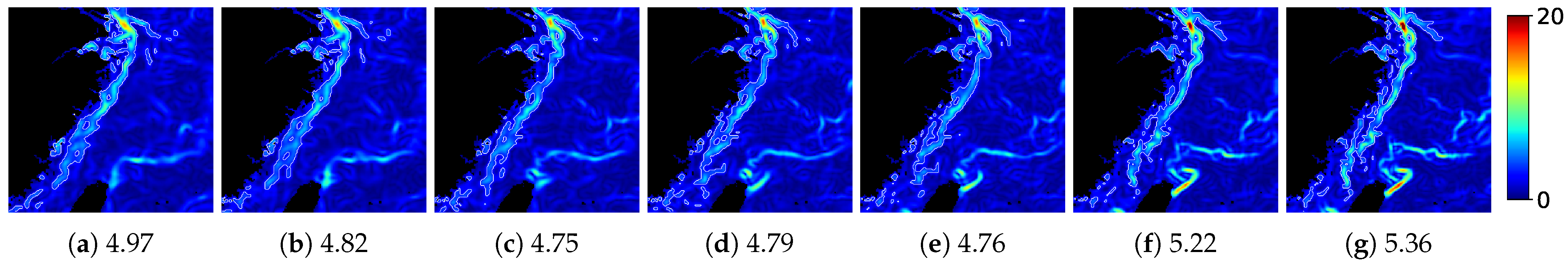 - Yang, Y.; Lam, K.M.; Sun, X.; Dong, J.; Lguensat, R. An Efficient Algorithm for Ocean-Front Evolution Trend Recognition. Remote Sens. 2022, 14, 259. [Google Scholar] [CrossRef]