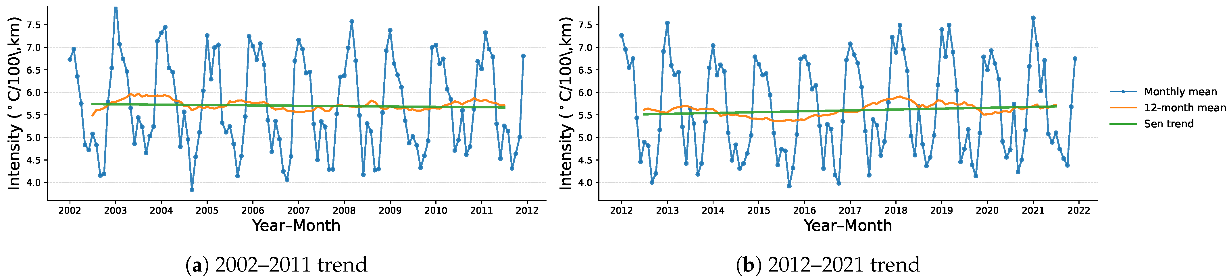 - Xing, Q.; Yu, H.; Wang, H. Global mapping and evolution of persistent fronts in Large Marine Ecosystems over the past 40 years. Nat. Commun. 2024, 15, 4090. [Google Scholar] [CrossRef]