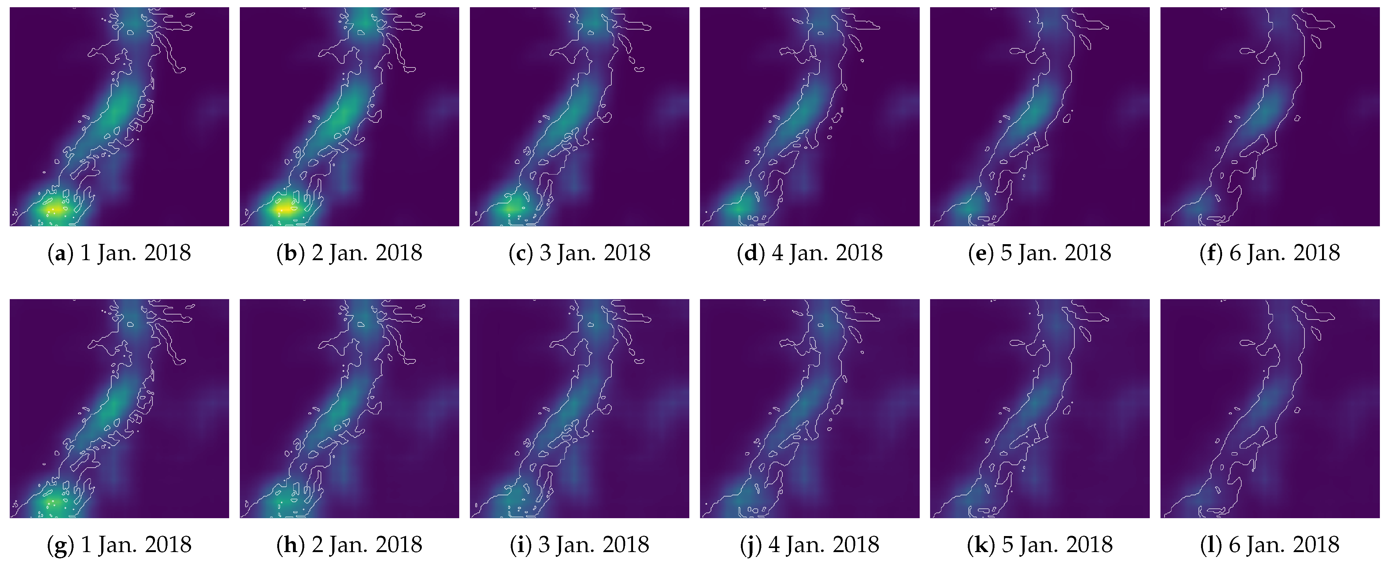 - Most short-term OFETR methods produce results that are restricted to the window level and therefore lack explicit representations of point-level changes at a temporal resolution commensurate with the underlying data. As illustrated in Figure 1, relying solely on window-level labels can obscure the within-window, fine-grained evolution of the front, including the strengthening during the stage shown in Figure 1a–d and the weakening during the stage shown in Figure 1d–f. Moreover, because available datasets differ markedly in temporal resolution, and because many studies now analyze daily or even subdaily scales, a single window-level output is increasingly inadequate for probing the mechanisms that govern front evolution [7,8,9,10,11,12,13,14].