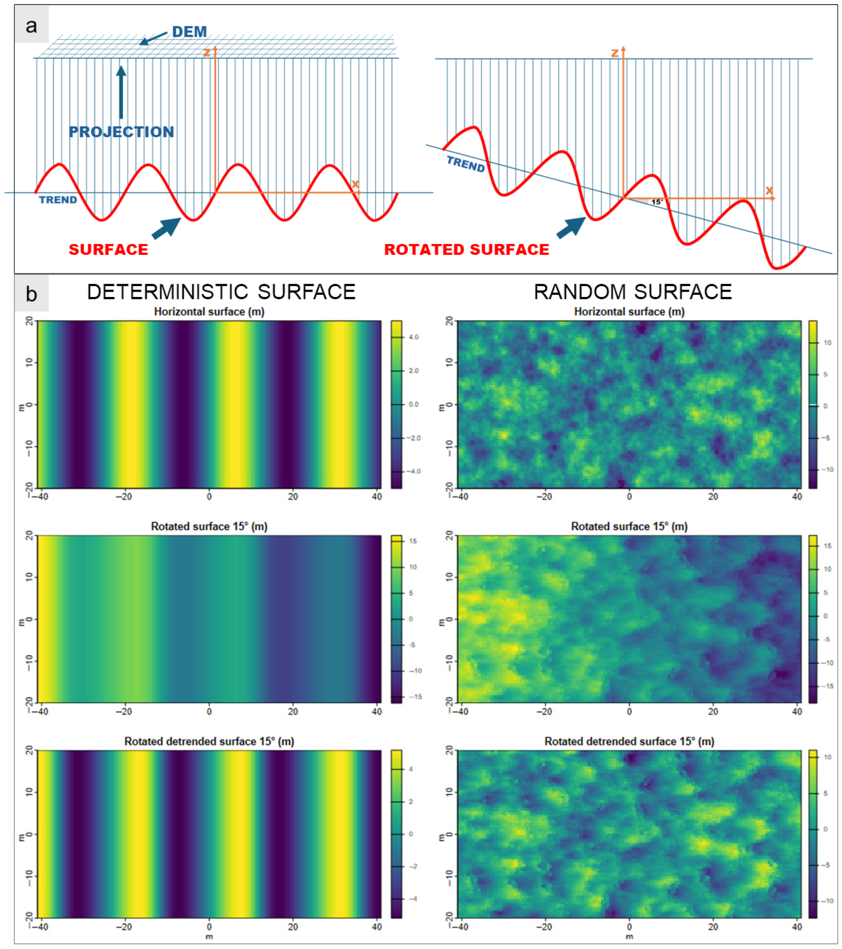 | Normal vectors dispersion (also known as vector ruggedness measure, VRM) | NVD | Based on circular statistics, computes the dispersion of normal vectors to the surface in a moving window. Compound measure of roughness highlighting morphological features at multiple wavelengths. Enhances elongated and linear features. The method can also be extended to the analysis of roughness anisotropy. Units: dimensionless. | [13,48,108,158] |