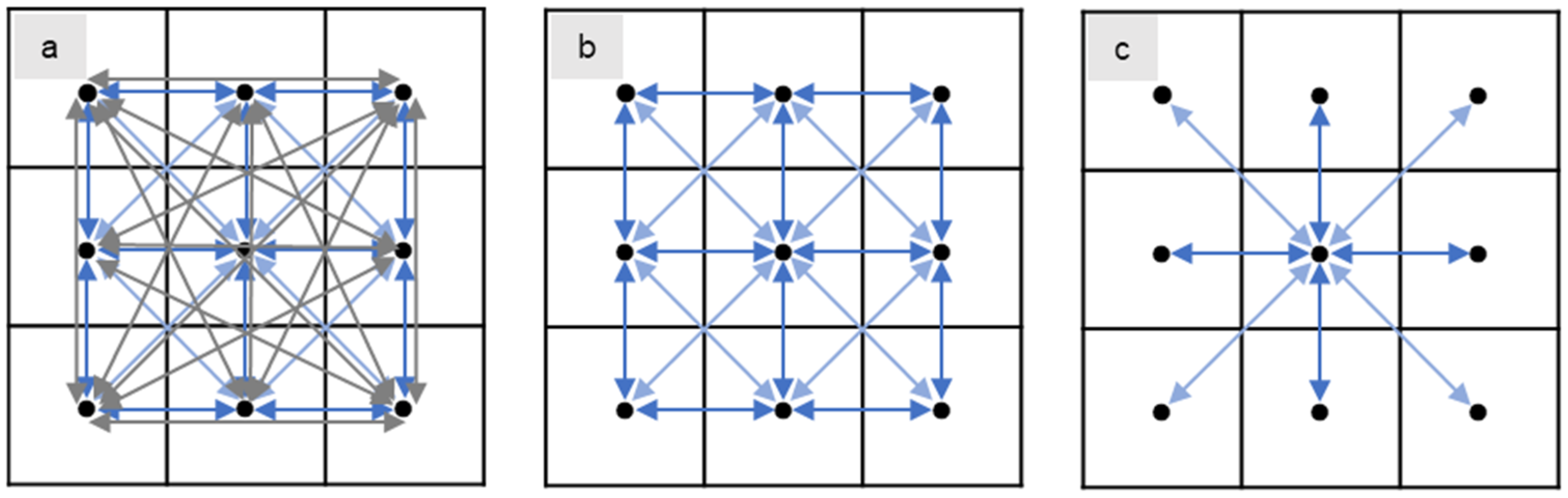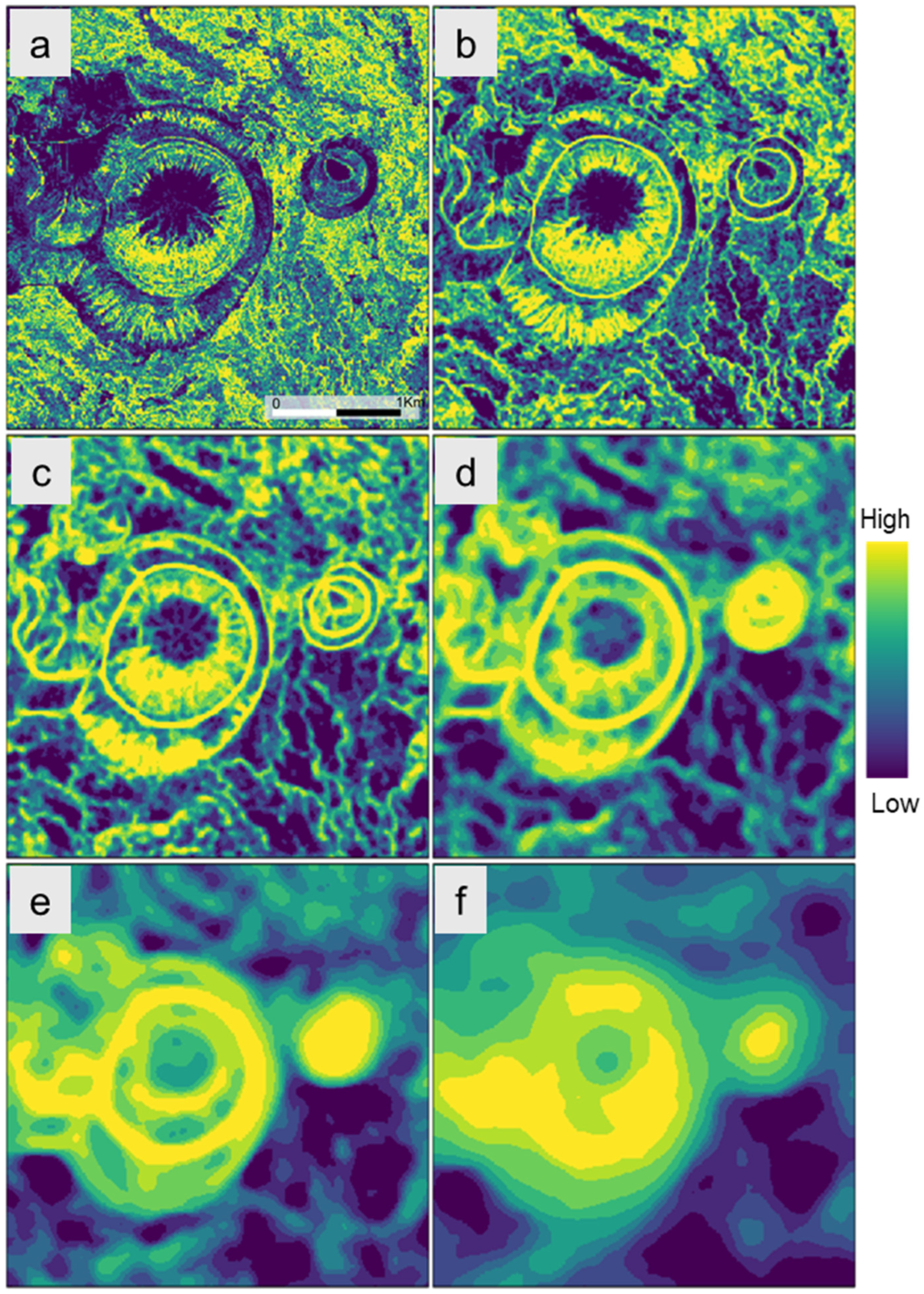| Radial roughness index | RRI | The RRI improves the TRI, reducing the dependence on slope using second order differences and correcting for the different distances between cardinal and diagonal directions. Larger kernel (5 × 5) with respect to the TRI. Units: m. | [131] |