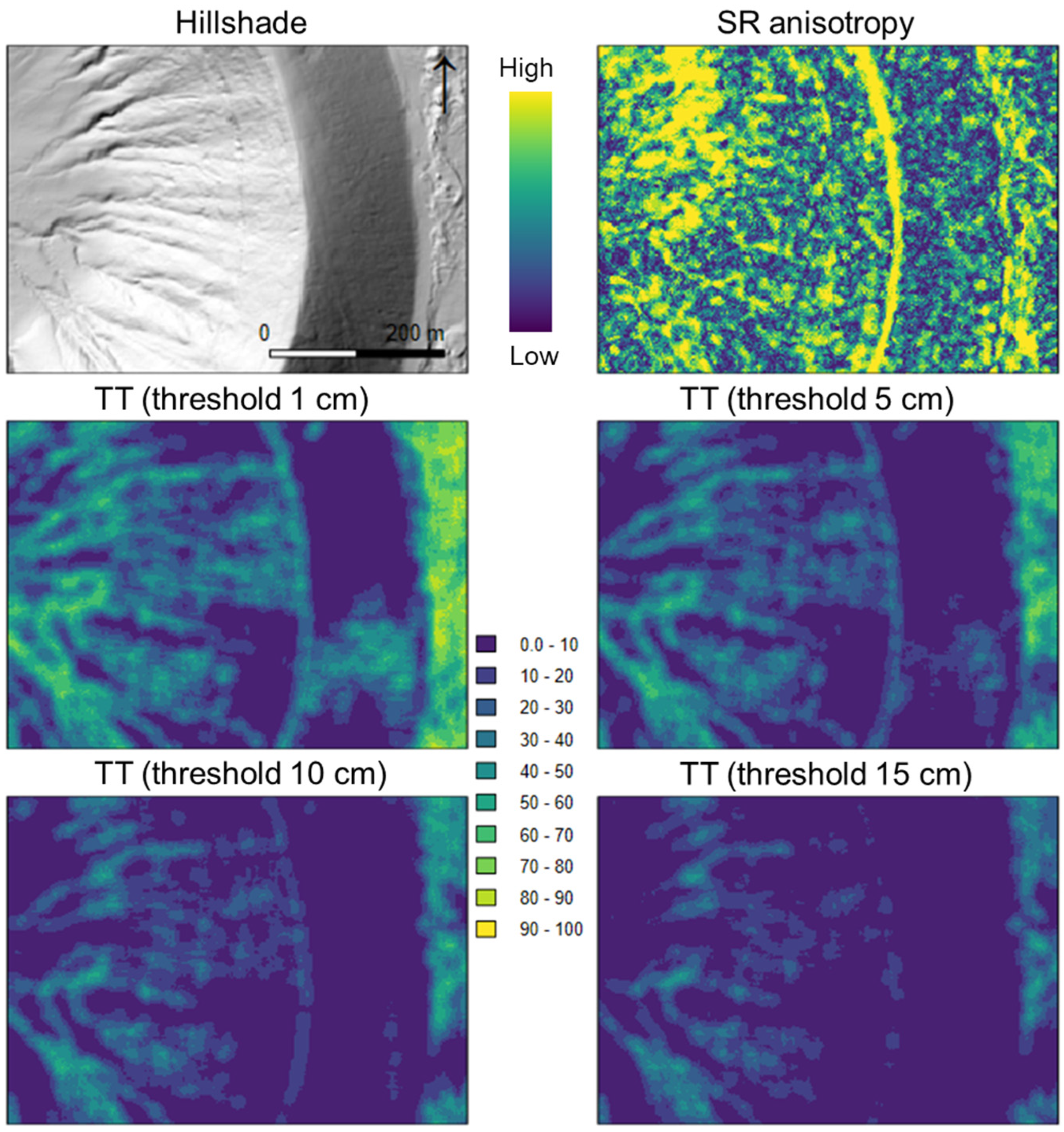 - Newman, D.R.; Lindsay, J.B.; Cockburn, J.M.H. Measuring Hyperscale Topographic Anisotropy as a Continuous Landscape Property. Geosciences 2018, 8, 278. [Google Scholar] [CrossRef]