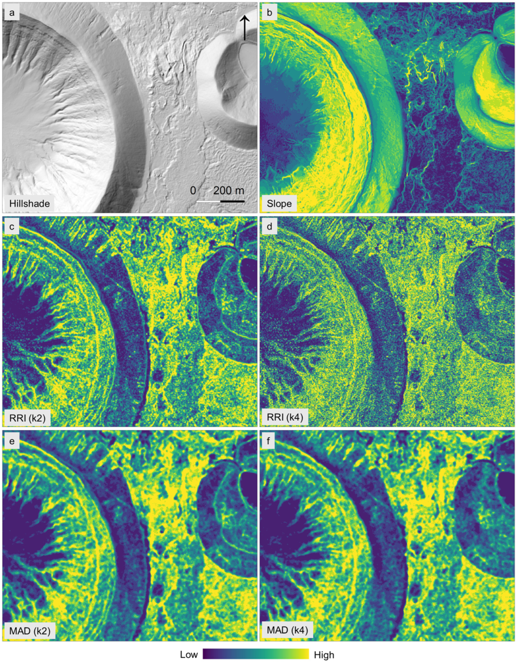 | Simplified geostatistical approach based on MAD of DDs of order 2 | MADk2 | Geostatistical-based SR indices using second order DDs. Applied directly to a DEM without detrending. Short-range roughness indices (max lag distance 2 pixels). In addition to omnidirectional roughness (units: m), also computes roughness anisotropy (strength and direction). | [111] |