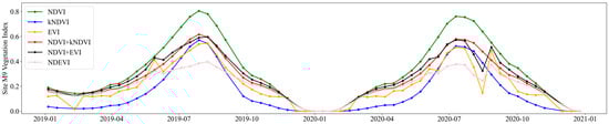 The temporal dynamics of the six vegetation indices.