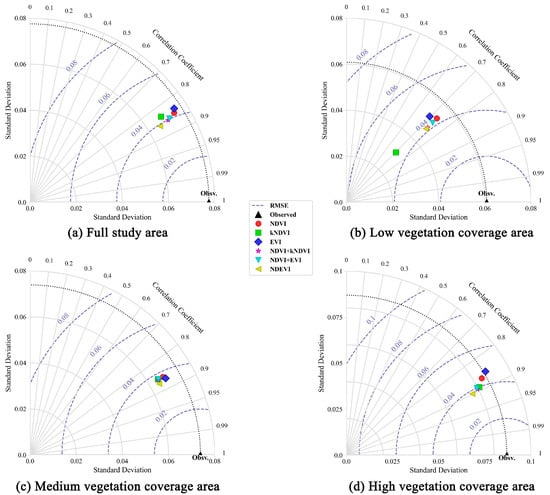 Taylor diagram of removing vegetation effects based on various vegetation indices in different vegetation coverage areas: (a) full study area, (b) low vegetation coverage area, (c) medium vegetation coverage area, (d) high vegetation coverage area.