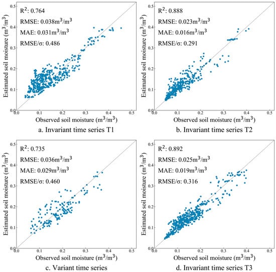 Soil moisture verification based on variant time series and invariant time series inversion: (a) Invariant time series T1, (b) Invariant time series T2, (c) Variant time series, (d) Invariant time series T3.