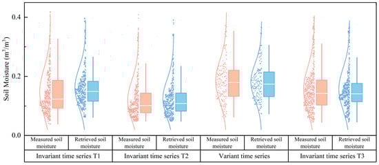 Soil moisture was retrieved based on three invariant time series and one variant time series; the results were shown in Figure 10. Compared with the long time series without eliminating abnormal events, the inversion of soil moisture based on three invariant time series and one variant time series achieved better results. Among them, the result of soil moisture inversion based on variant time series was the worst—R2 reached 0.735, RMSE/σ reduced to 0.486; the result of soil moisture inversion based on invariant time series T3 was the best—R2 reached 0.892, RMSE/σ reduced to 0.316. This discrepancy likely originates from the instability of surface parameters during the change time series. It can be seen that it is of great significance to divide the long time series into invariant time series. Significant variations existed in soil moisture inversion results derived from different invariant time series. To better visualize the distribution of soil moisture inversion across these time series, a grouped box plot (Figure 11) was constructed, illustrating the comparative trends and variability in soil moisture estimates.
